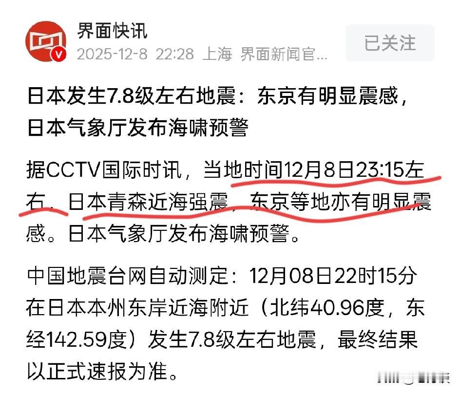 难道新闻穿越了吗!现在还没有到晚上十一点呢,新闻怎么就播报了日本十一点后爆发了强地震呢,东京也有强烈预感。震级不小!太可怕了!看到这里,也就能够明白日本千方百计在全球各地找第二块国土了,毕竟日本经常地震,而且若干年后,整个日本可能会被海水淹没他们必须找到容身之所。所以他们到巴西买地,所以他们对周边陆地国虎视眈眈。
