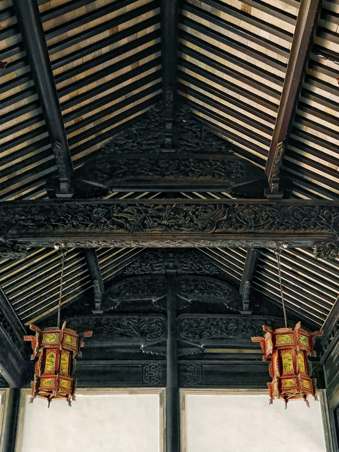 🔸正厅古松堂为仿明建筑,步柱顶端四对棹木造型如古代的官帽帽翼,又称官帽厅。正中方橼上饰八只琵琶容易被忽略,寓意“八音联欢”(苏州弹词曲牌名)。