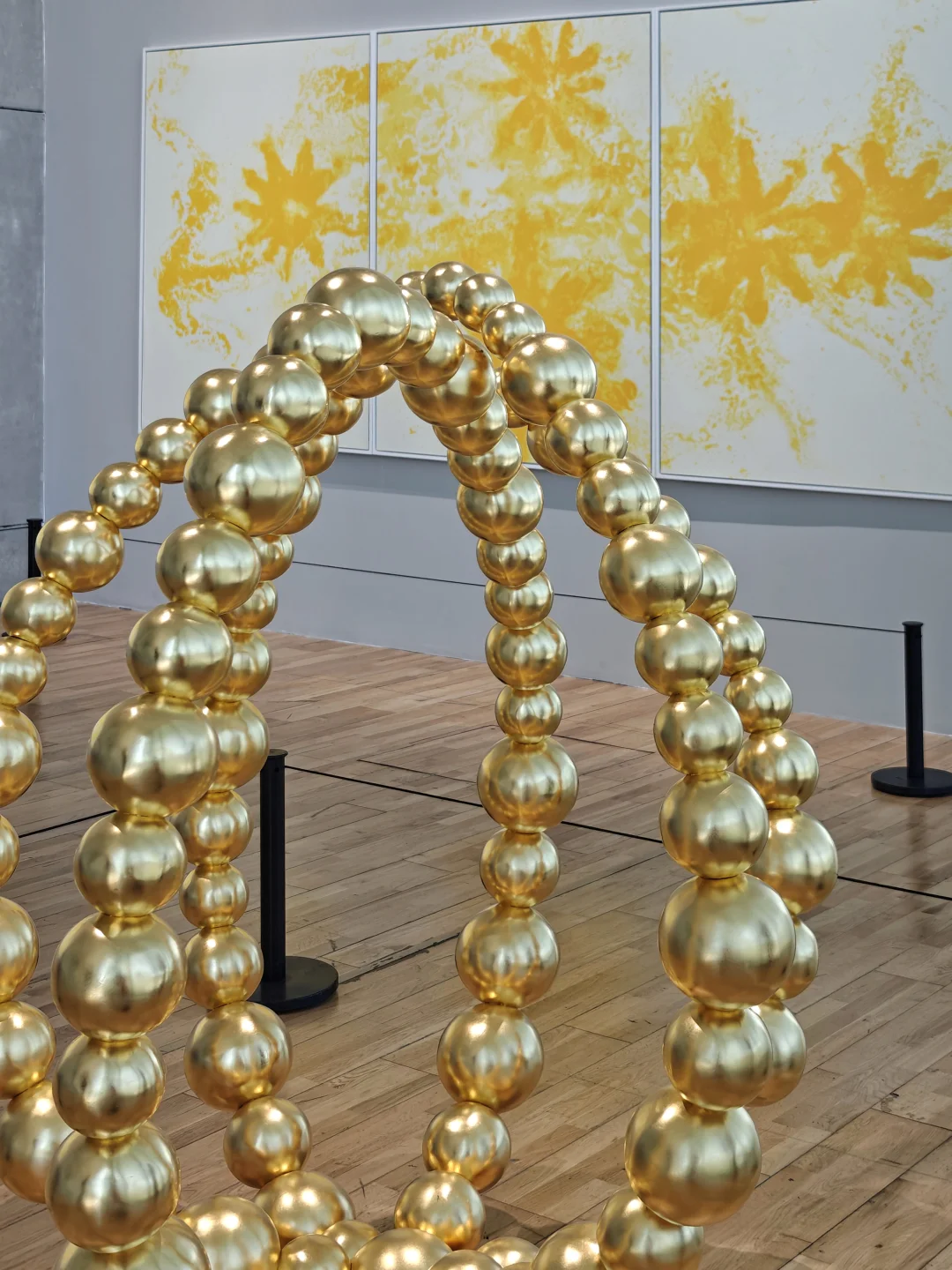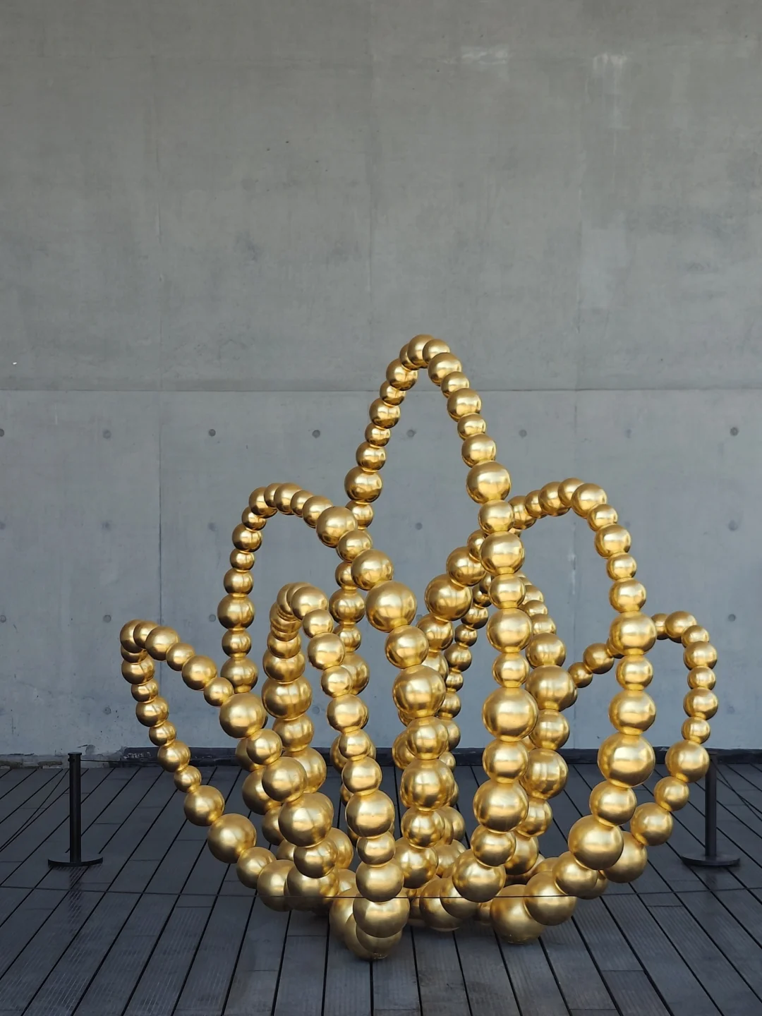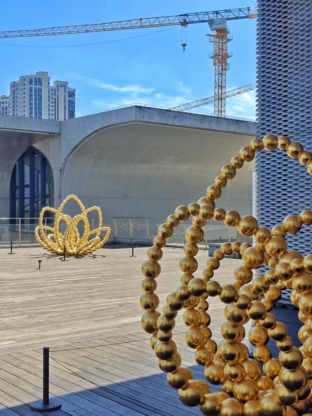 🧬2楼的螺旋上升形作品,与开阔落地窗外的西岸漩心建筑形成有趣的重叠视角,屋顶的3组金色莲花形作品从不同角度组合观察,形成不同的视觉感受。
