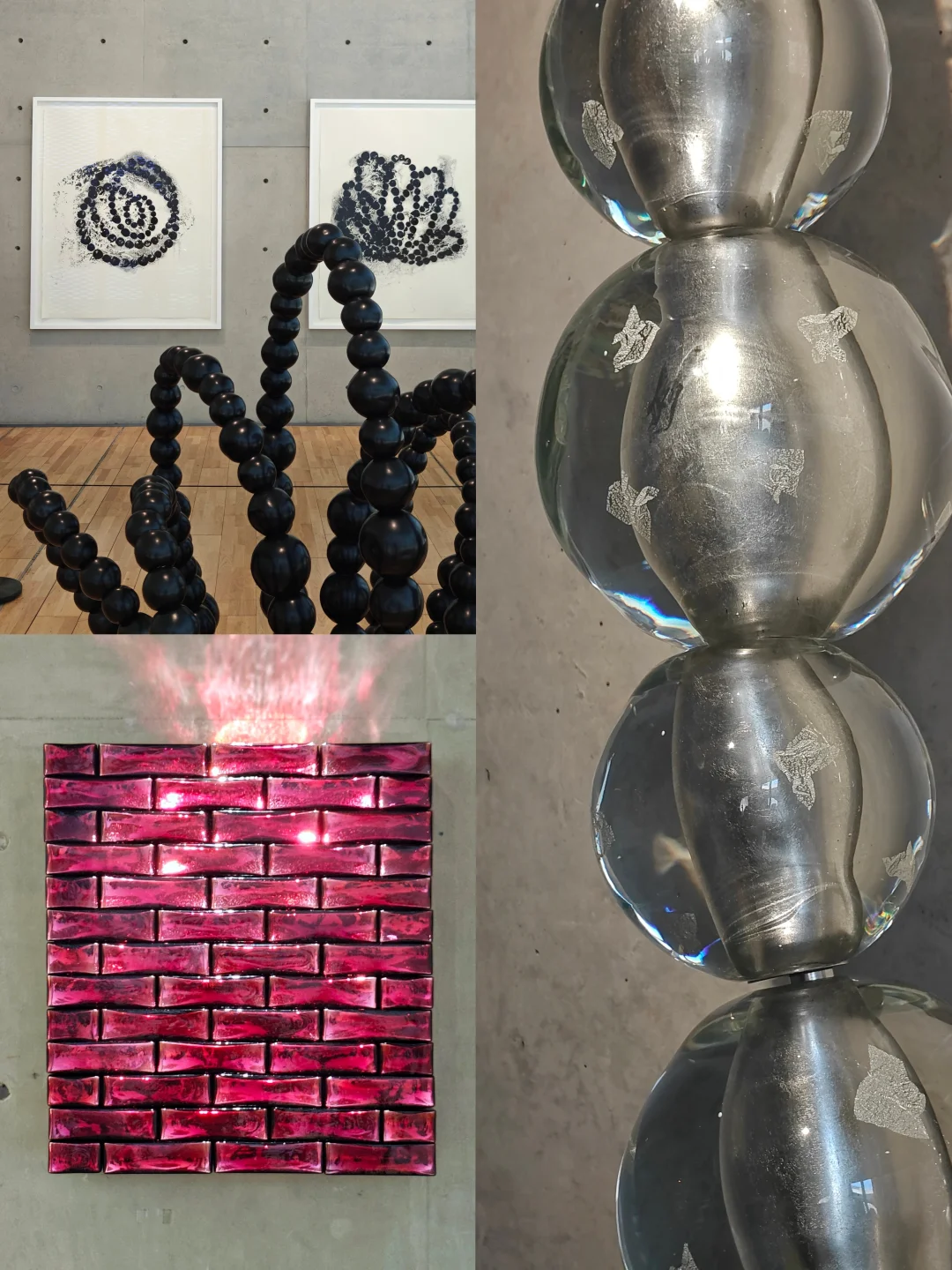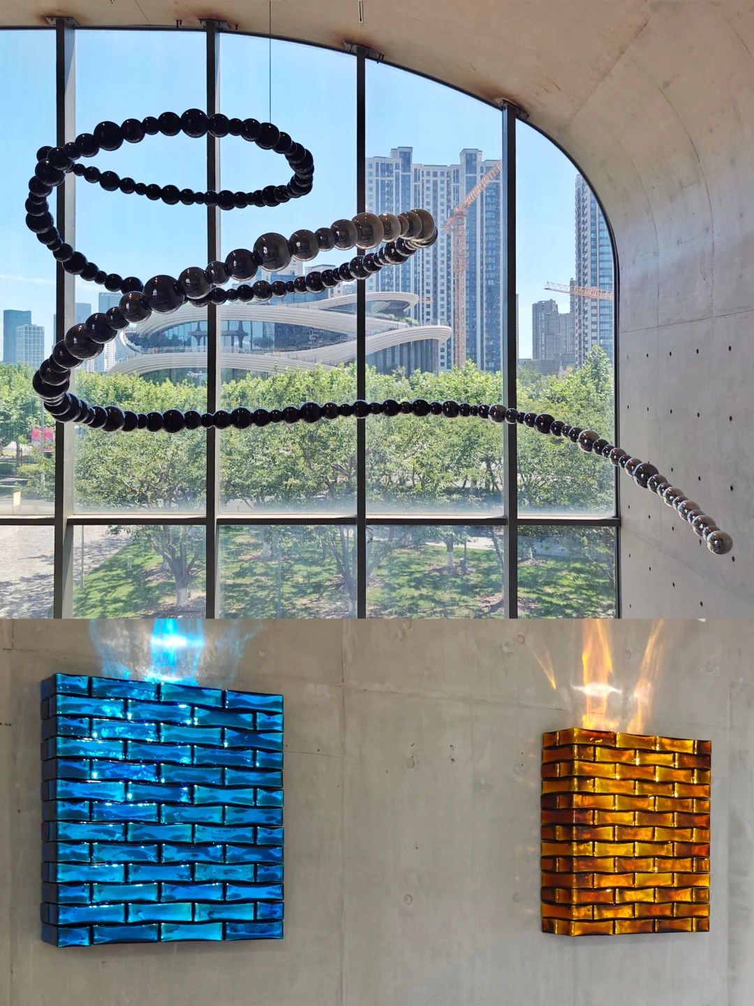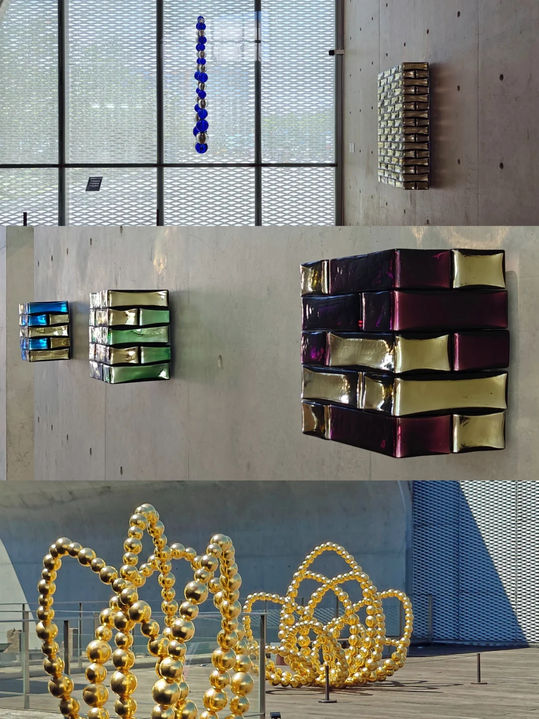 🌈彩色玻璃珠串和砖块色彩斑斓,搭配堆叠后在龙美术馆独特结构和光影下,呈现出丰富造型与魔幻色泽,散发清冷反射光,似从物体内部透出,营造夜间视觉感受,为粗野主义建筑注入奇幻氛围。