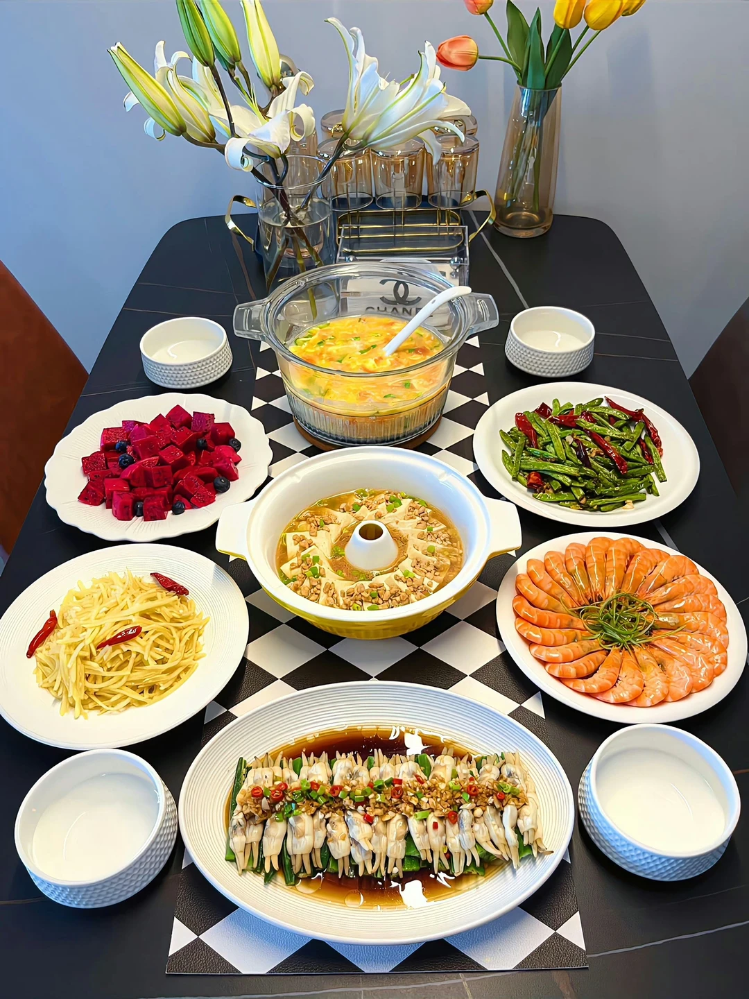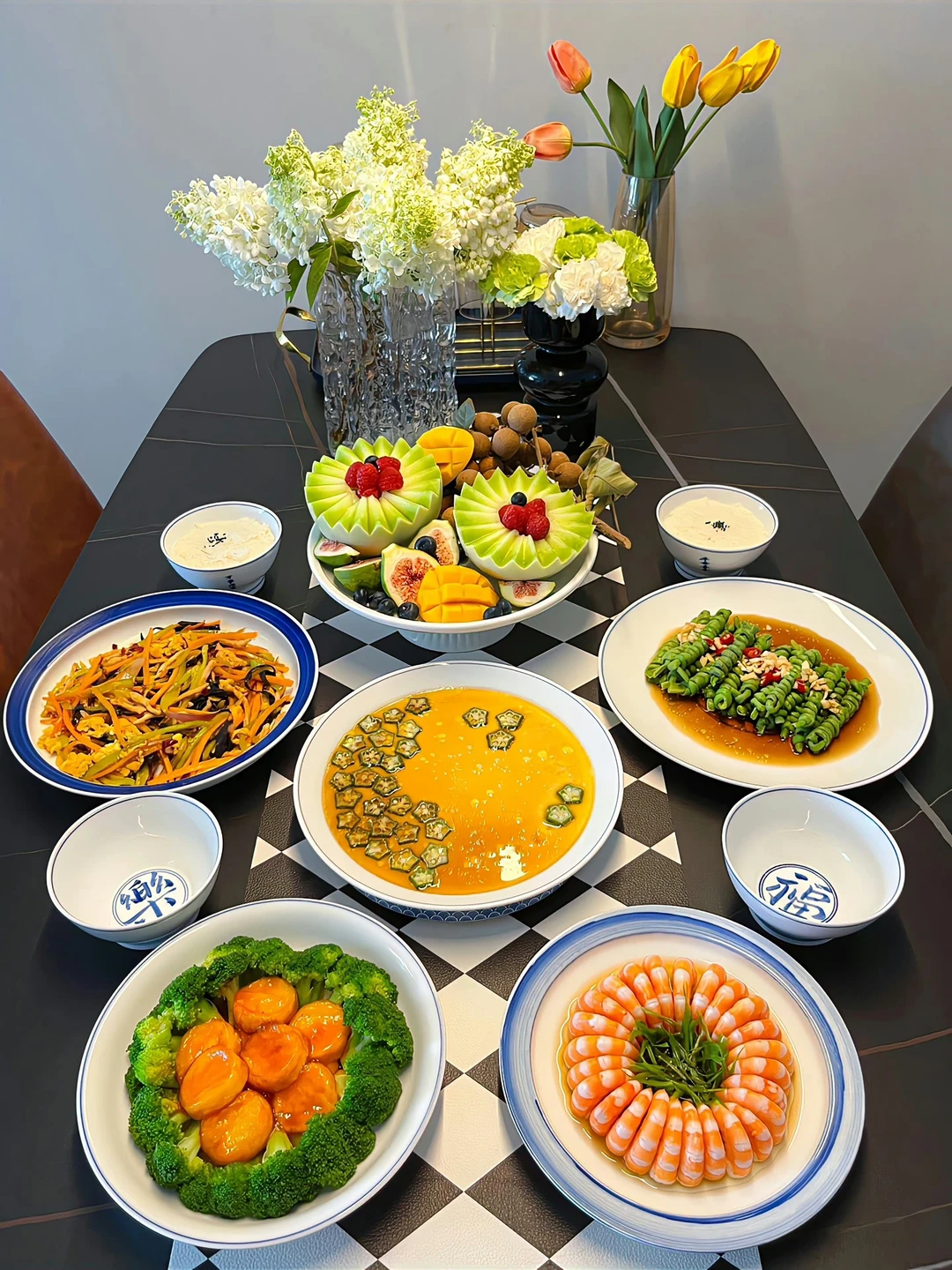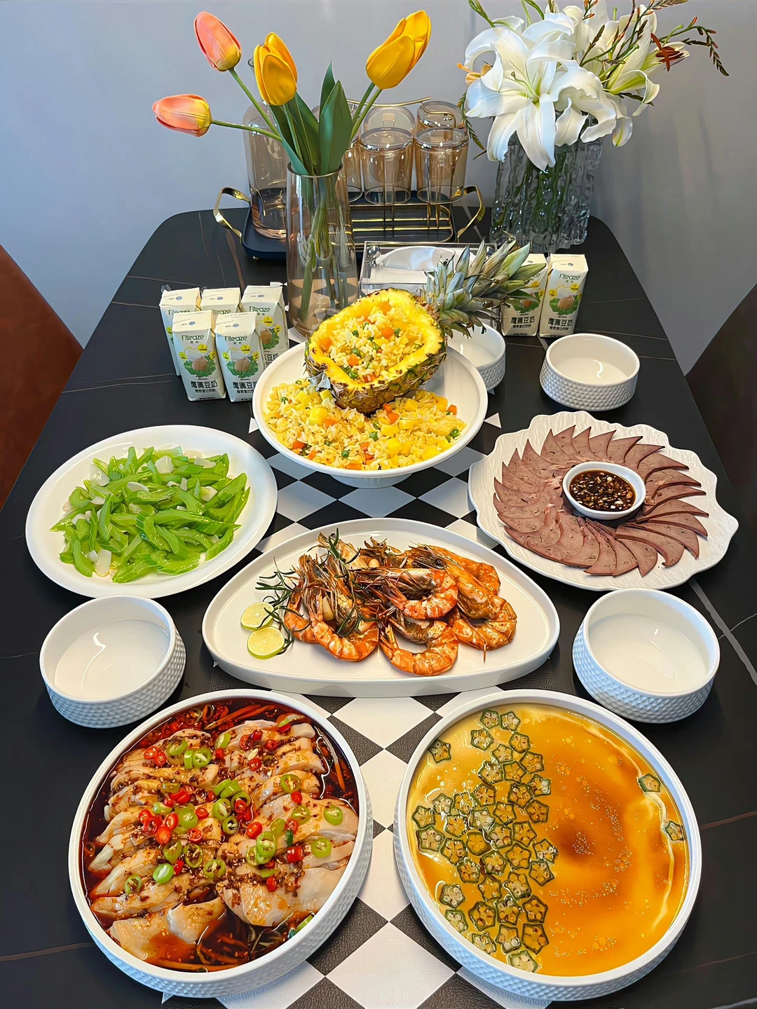 周1️⃣:花开富贵虾➕四喜丸子➕青花椒鱼➕白灼秋葵➕手抓扇子骨➕白灼汁海螺➕水果拼盘