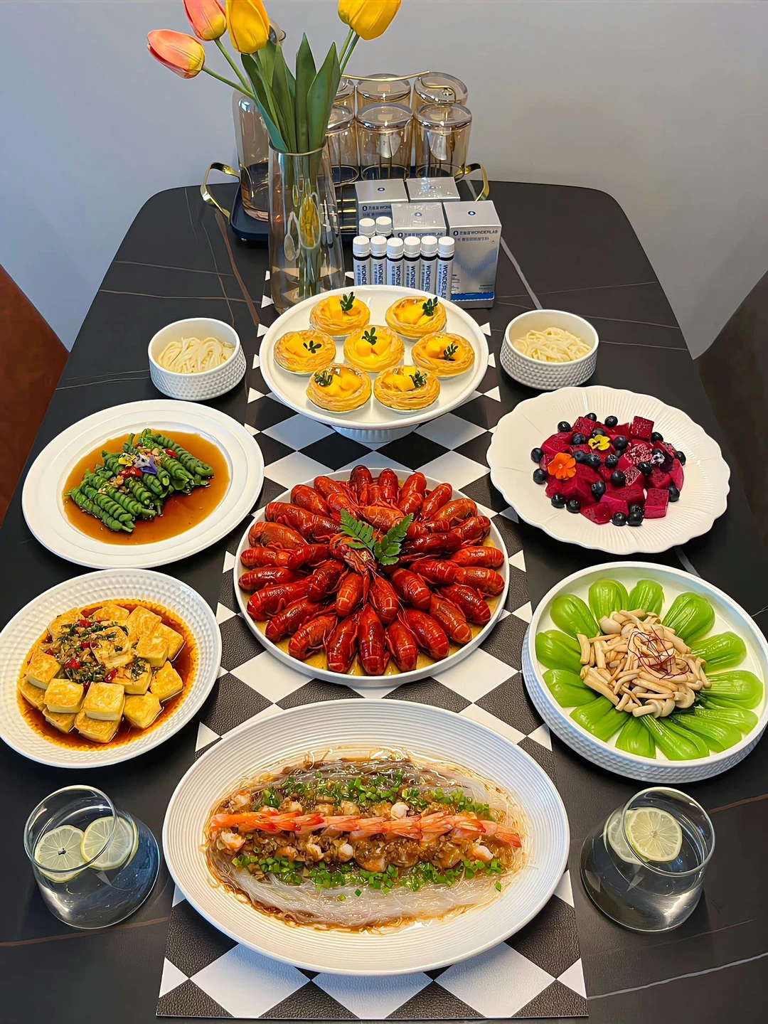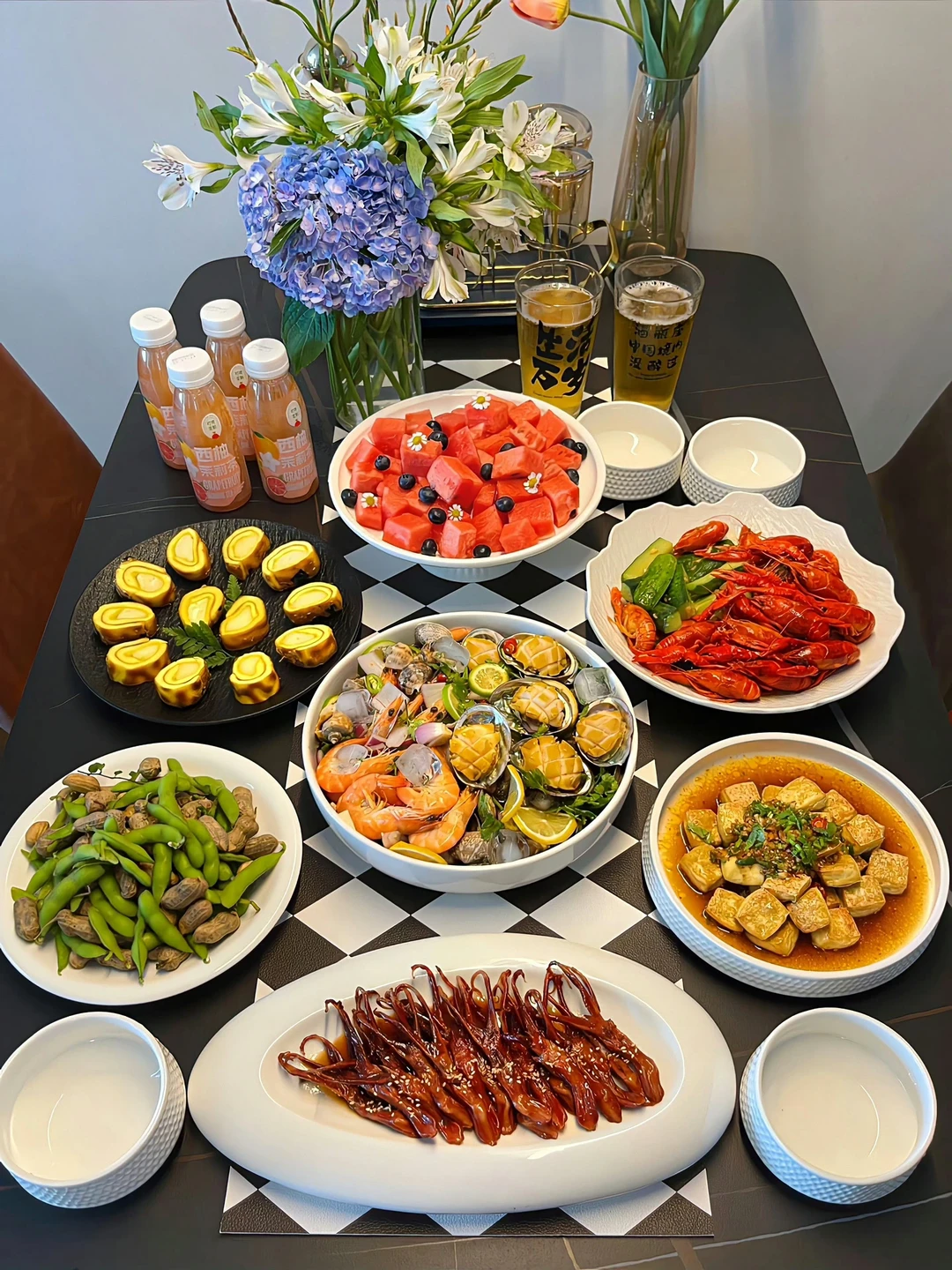 周日:捞汁海鲜➕蒜蓉小龙虾➕可乐鸭舌➕虎皮麻薯松松卷➕毛豆花生➕烤豆腐➕西瓜果切➕西柚茉莉茶