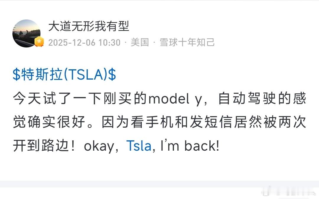 段永平竟然买了 Model Y,看样子是被北美满血版FSD圈粉了,最近在雪球上发了条动态,说试了下新买的 Model Y 感觉确实很好,而且因为开车看手机和发短信被FSD强制靠边停车了。目前特斯拉在美国推出的最新 FSD 系统版本是 v14.2.1,某些场景下允许驾驶者看情况发短信,但要注意力集中,如果过度分心系统就强制接管并靠边停车。至于国内的FSD实际上只是加强版辅助驾驶+城市NOA,比如复杂施工路段、障碍物绕行、自动泊车等等差距非常大,基本不是一个东西……段永平特斯拉特斯拉modely特斯拉modely特斯拉modelyfsd特斯拉fsd自动驾驶