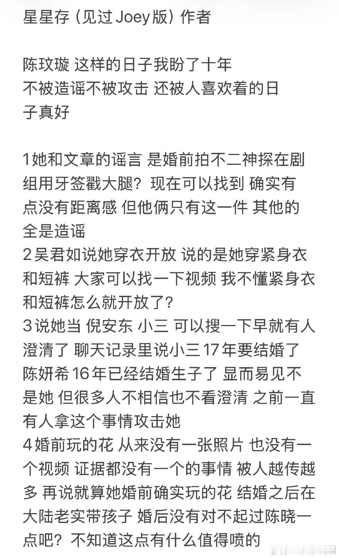 陈妍希10年老粉发文陈妍希粉丝 这样的日子盼了10年 近日,一位陈妍希十年老粉发文澄清其过往争议,心疼她长期被无据攻击,并感慨“不被造谣、被人喜欢的日子真好”,“盼了十年的安稳日子终于来啦”。