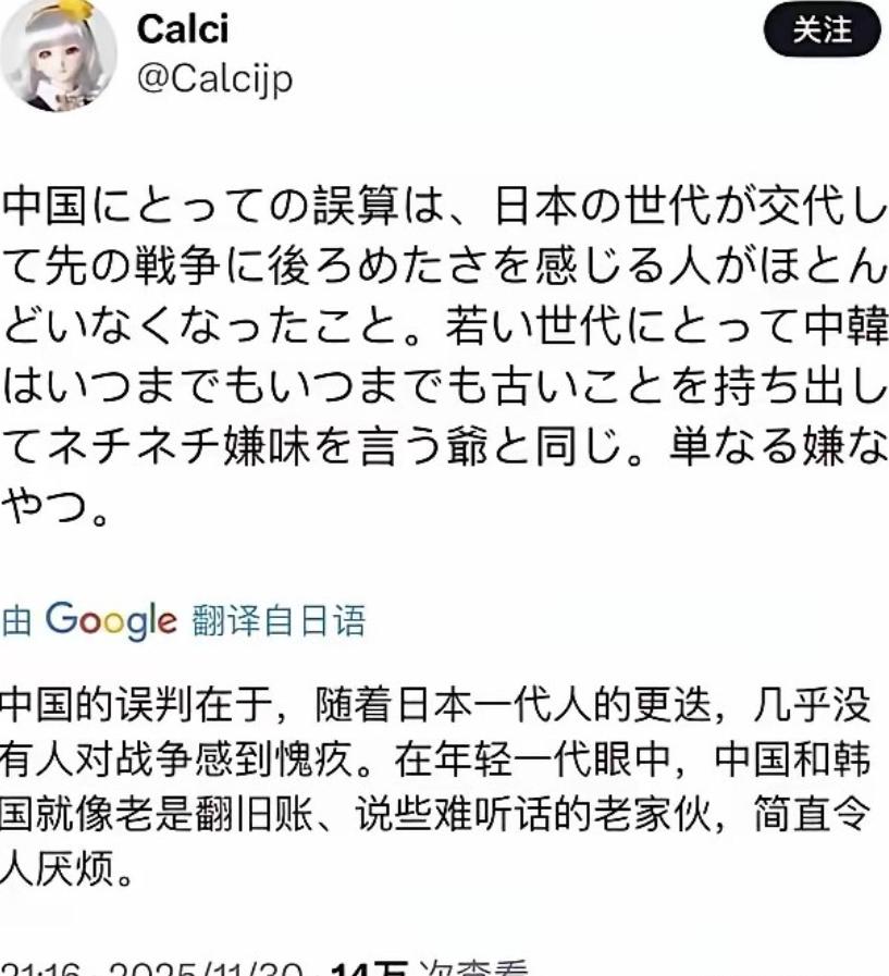 告诉你一个真实的日本! 近日,日本网友竟这样说:中国误判日本了,日本的年轻一代,几乎没有人对日本过去的侵略战争感到愧疚,在这些年轻一代的日本人眼中,中国和韩国老是在翻旧账,简直令人厌烦。 其实若不是这些日本网友跳出来喊话,或许很多人还没意识到,这个邻邦的年轻一代,早已在历史认知上和我们拉开了一道看不见的鸿沟。 他们中不少人连 8 月 15 日是什么日子都答不上来,更别提对祖辈那场侵略战争有半分愧疚。 反倒觉得中韩总揪着历史不放是 “翻旧账”,这份认知的割裂,恰恰暴露了日本最擅长的本事:不动声色地隐藏自己的真面目。 这种离谱的历史认知,根源首先埋在课本里。 日本的历史教科书早就成了“历史整容院”。 右翼势力主导的编撰机构,把甲午战争包装成 “维护东亚秩序的无奈之举”,把七七事变轻描成 “郊外偶然摩擦”,连南京大屠杀都要加上“伤亡人数存疑”的模糊注脚。 硬生生把一场侵略战争改成了 “自卫反击” 的戏码。 更讽刺的是,这种“洗白”课本还能顺利通过文部科学省的审核,堂而皇之地走进课堂。 而这种课本带来的认知偏差,又和日本独特的文化氛围缠在了一起,让历史彻底成了 “遥远的故事”。 日本社会向来有 “向前看” 的惯性,觉得过去的事就该翻篇。 再加上“不给别人添麻烦”的处世逻辑,他们不愿直面祖辈的罪责,更不想因为历史问题和周边国家起冲突,久而久之就形成了 “历史很遥远,没必要揪着不放” 的集体默契。 年轻人在这种氛围里长大,既没从课本学到真相,又没从社会听到反思,自然觉得中韩的历史追责是“小题大做”,甚至生出厌烦。 就在这种扭曲的认知氛围里,日本的一系列动作正悄悄发生着变化,曾经的敏感议题,如今竟成了 “常规操作”。 政客年年去靖国神社参拜战犯,从前还会顾忌中韩的抗议,现在却越来越理直气壮,甚至把参拜当成 “守护民族传统” 的标签。 国防预算更是连年攀升,从购买先进战机到研发远程导弹,动作一个比一个大,却对外只说是 “保障国家安全”。 这些放在过去会引发轩然大波的举动,现在在日本国内竟没多少反对声音,年轻人要么漠不关心,要么觉得“这是国家该做的”,悄无声息间,整个国家的风向都变了。 最无奈的是,如今中日之间早已陷入“各说各话”的僵局。 我们拿着铁证如山的史料,要求日本正视历史、承担罪责;可日本的年轻人,捧着被篡改的课本,听着政客的话术,只觉得我们是在“道德绑架”。 双方站在完全不同的认知维度里,谈历史成了鸡同鸭讲,谈未来更是隔着一层厚厚的壁垒。 日本靠着篡改课本和文化惯性,成功隐藏了历史的真面目,也让两国的隔阂,在无声无息中越来越深。