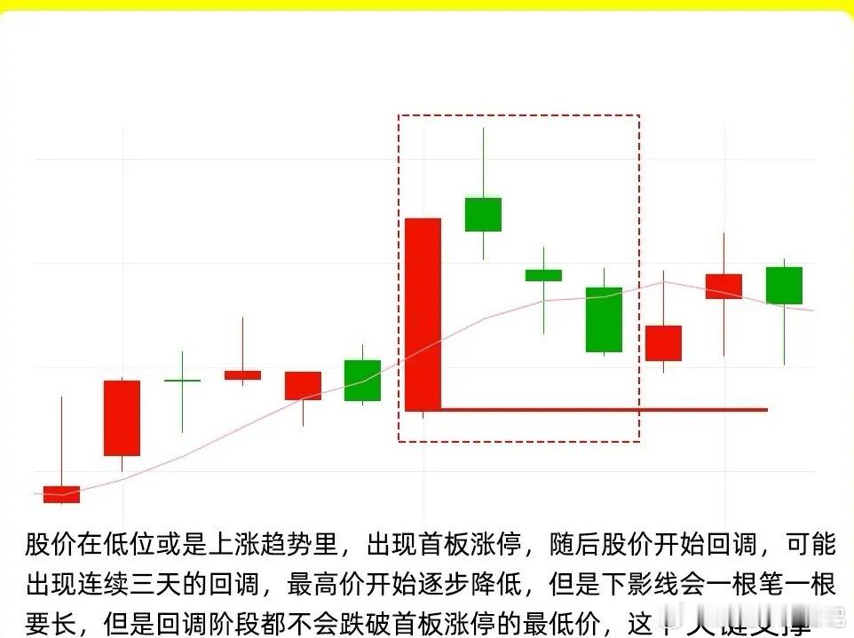 注意了!很多人看不懂首板回调,行情加速期里,涨停后一回调就慌了手脚、不知所措。今天欣姐拆解首板回调三大核心形态,专做龙头的朋友,这篇干货一定要盯紧吃透!老规矩,点赞收藏+评论178支持一波,每天分享实战炒股技巧,免得后续温习找不到~ 涨停板本身就是明确的主力动作,回调背后全是洗盘逻辑,看懂少踩坑!一、缩量回踩形态低位或上涨趋势中出首板涨停,后续以小阴线回落,成交量直接缩倍量,是最常见的健康回调形态。核心关键:缩量回踩不跌破首板最低价,缩量代表主力未出货,筹码锁定扎实。二、横盘整理形态低位首板涨停后不续涨,转而高位横盘震荡,多是小阴小阳或十字星走势。核心关键:横盘全程围绕首板价格区间窄幅波动,主力震荡消化浮筹,等待二次拉升契机。三、潜底震荡形态低位或上涨趋势首板后,可出现连续3天回调,最高价逐步走低,但下影线一根比一根长,核心底线是始终不跌破首板最低价(关键支撑位),本质就是“三阴不破阳”形态,主力低位反复吸筹蓄力。这三类回调本质都是主力洗盘手法,首板后快速清洗不坚定筹码,且洗盘周期通常不超7天,耗时太久易失人气,把握好节奏就能跟上主力后续拉升。以上都是首板回调的基础核心内容,吃透就能避开回调恐慌,精准抓二次机会~