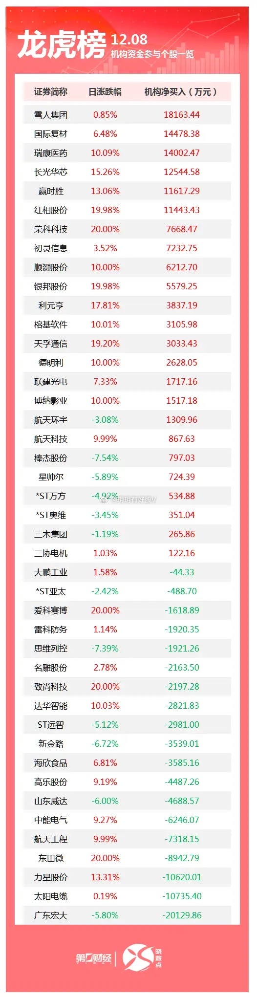 龙虎榜丨机构今日买入这24股,卖出广东宏大2.01亿元盘后数据显示,12月8日龙虎榜中,共43只个股出现了机构的身影,有24只股票呈现机构净买入,19只股票呈现机构净卖出。当天机构净买入前三的股票分别是雪人集团、国际复材、瑞康医药,净买入金额分别是1.82亿元、1.45亿元、1.4亿元。当天机构净卖出前三的股票分别是广东宏大、太阳电缆、力星股份,净流出金额分别是2.01亿元、1.0亿元、1.06亿元。