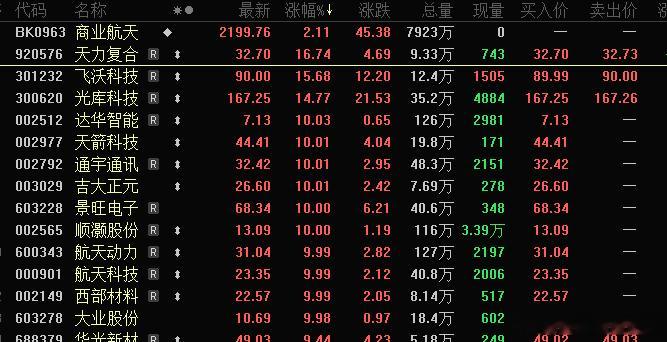 价值投资日志 商业航天板块继续强势12月8日,商业航天板块持续强势,行业指数盘中最高上涨3.84%,收盘上涨1.34%,近11个交易日累计上涨16.27%,板块中天箭科技、航天科技、航天动力、达华智能、*ST铖昌等个股涨停,其中*ST铖昌为一字涨停,已实现两连板,收盘涨停板封单仍有2.4万手。