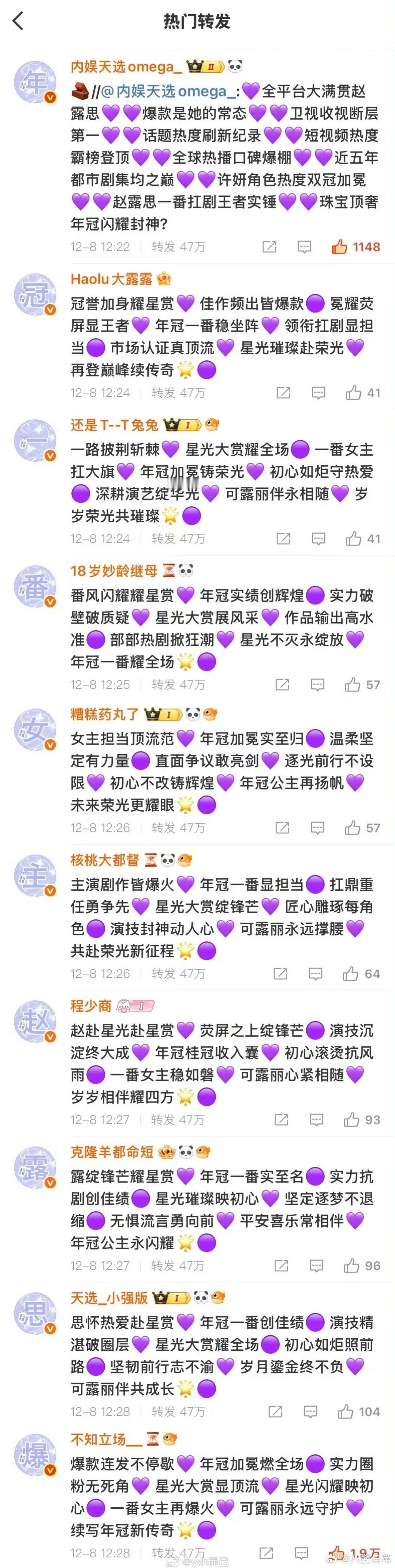 赵露思粉丝在星光大赏转发排字:年冠一番女主赵露思爆