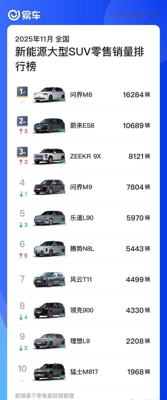 这年头,真没啥护城河,谁强谁销量高,挺公平的。大型SUV市场变天了,蔚来ES8销量排第二,极氪9X第三!但极氪9X价格46.59-59.99万,50万级以上销量第一。腾势N8L也起来了,一把上升了5名。