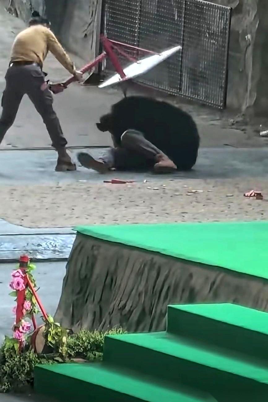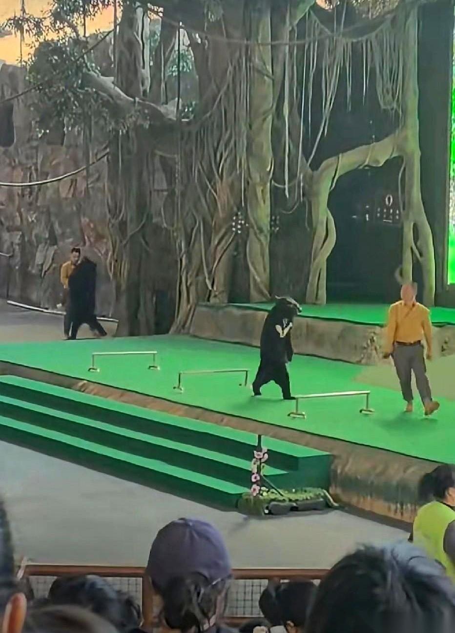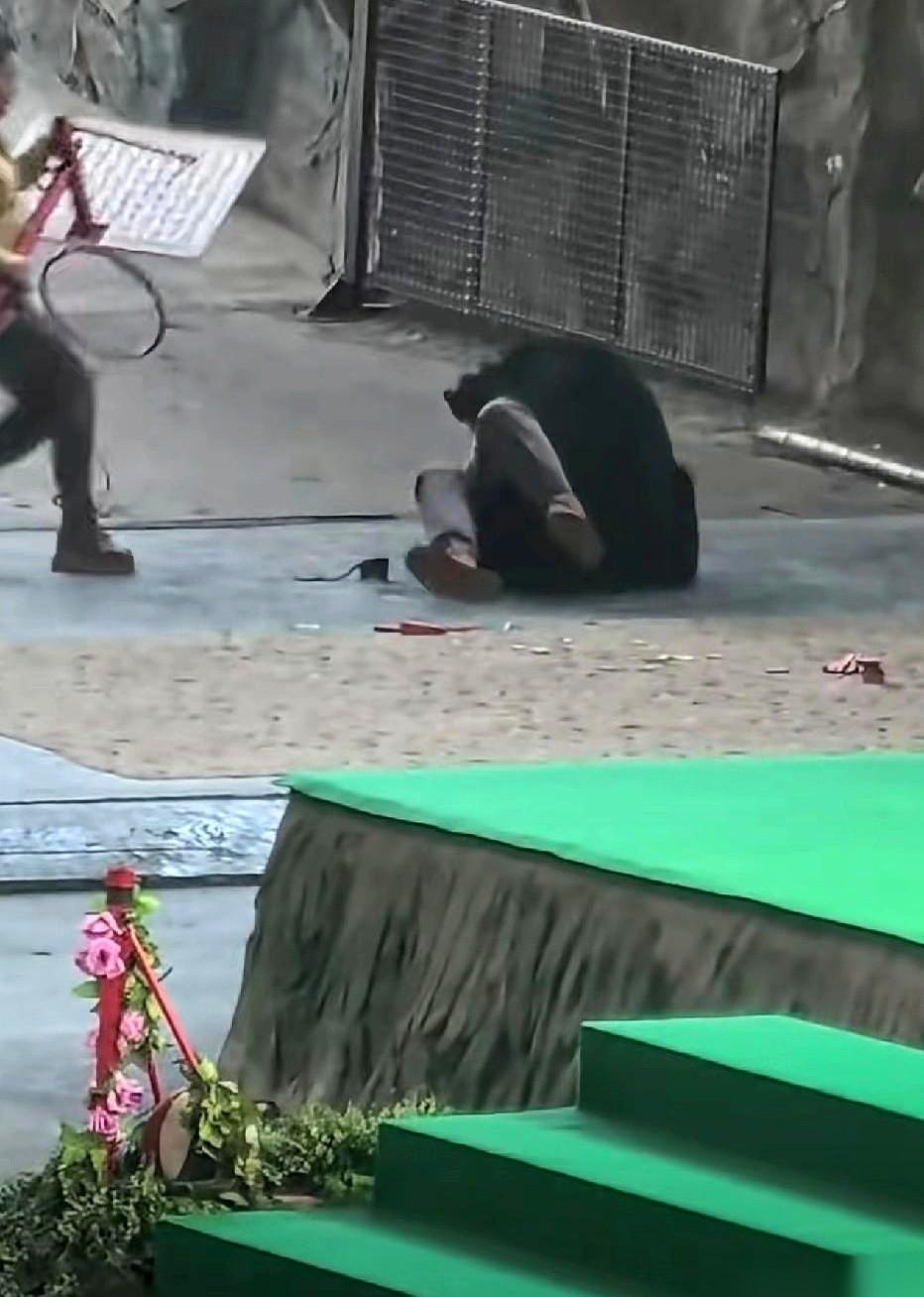 那只熊,前一秒还在鞠躬作揖讨人笑,后一秒就把养它的人按在地上撕咬。 视频里,工作人员抄起塑料凳子就往熊身上砸,连拉带拽,现场乱成一锅粥。 我看着都手心冒汗。 说真的,那一刻我没觉得熊有多可恨。 我只觉得,这玩意儿,装不住了。 你把它爪子拔了,牙磨了,天天用吃的哄着,逼着它学人样,穿上可笑的裙子,就以为它忘了自己是谁了? 野性这东西,是刻在基因里的,你一天给它喂三顿山珍海味,它也变不成人。 它不是员工,你给它发工资,它就能高高兴兴上班打卡的。 熊可怜,人也可怜。 一个被剥夺了本性,一个在拿命换盒饭。 说白了,这种所谓的“表演”,就是一场赌博。 用饲养员的命,赌野兽今天心情好不好。 太扯了。 以后谁再跟我说动物表演多精彩,我真想把这视频甩他脸上。 别再去看这些了。 掌声的背后,全是血和泪。人的,也是动物的。