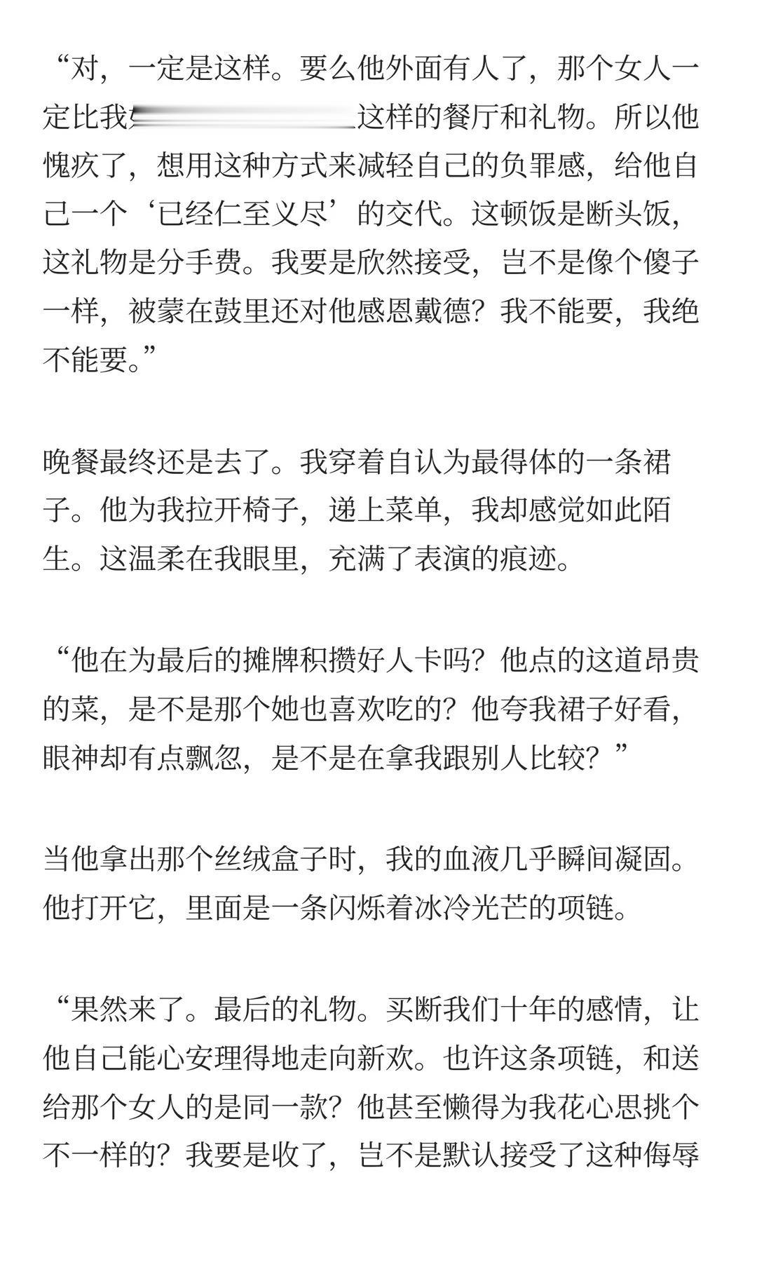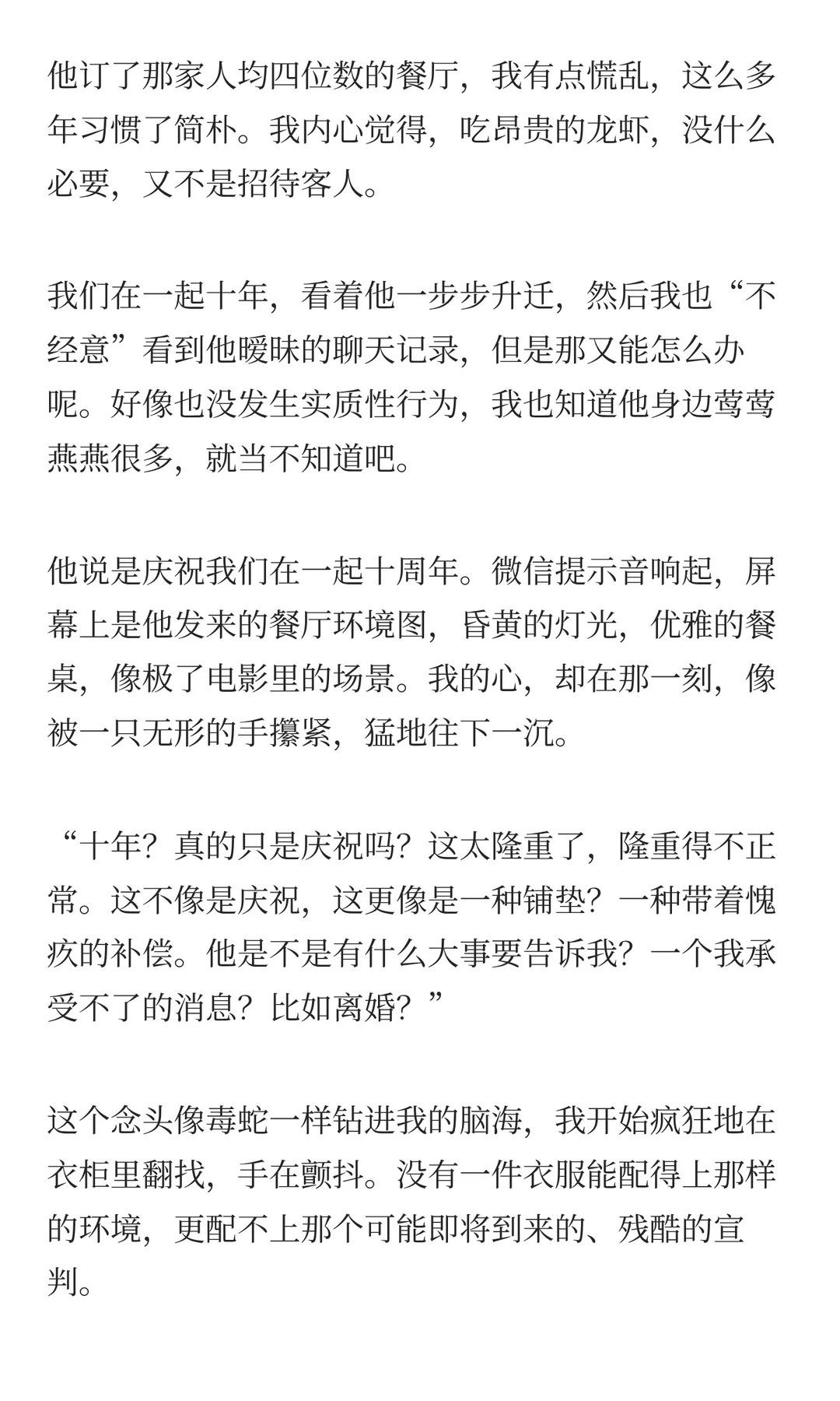 他说是庆祝我们在一起十周年。提示音响起,屏幕上是他发来的餐厅环境图,昏黄的灯光,优雅的餐桌,像极了电影里的场景。我的心,却在那一刻,像被一只无形的手攥紧,猛地往下一沉。