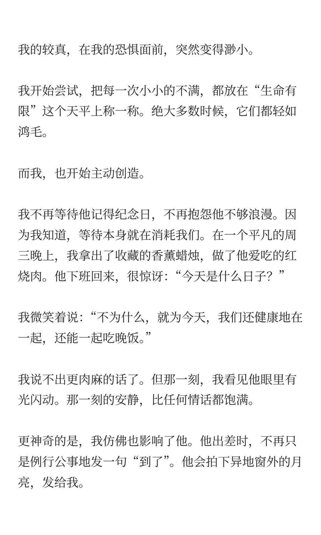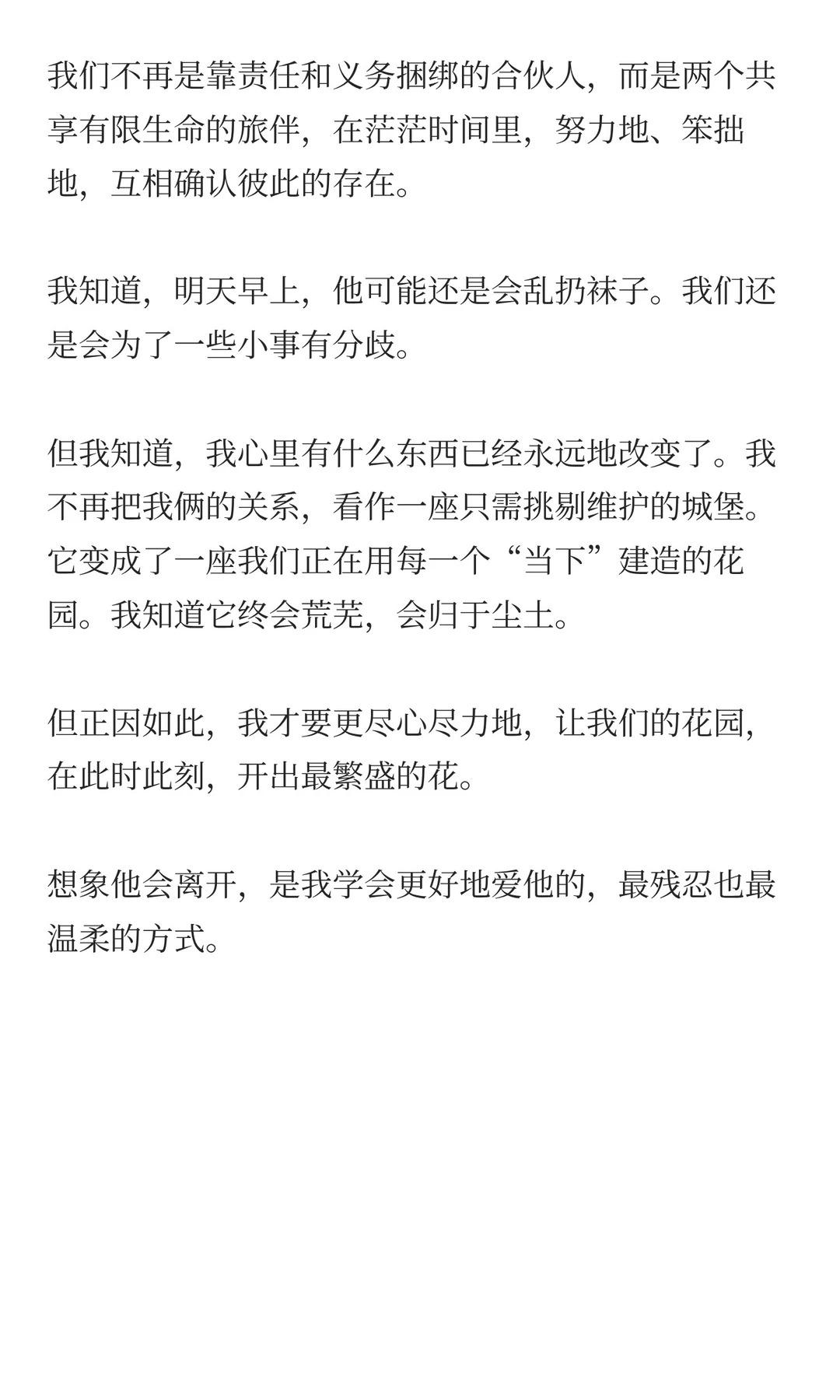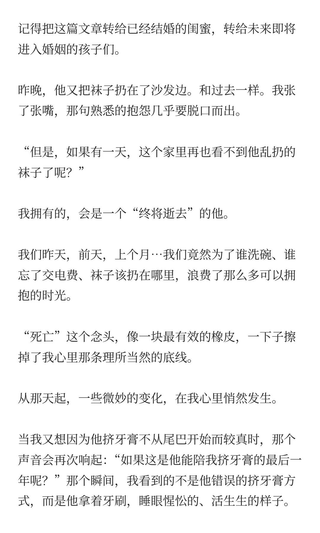 最好的婚姻观,是做好随时会离婚的准备啊。记得把这篇文章转给已经结婚的闺蜜,转给未来即将进入婚姻的孩子们。 昨晚,他又把袜子扔在了沙发边。和过去一样。我张了张嘴,那句熟悉的抱怨几乎要脱口而出。 “但是,如果有一天,这个家里再也看不到他乱扔的袜子了呢?” 我拥有的,会是一个“终将逝去”的他。 我们昨天,前天,上个月…我们竟然为了谁洗碗、谁忘了交电费、袜子该扔在哪里,浪费了那么多可以拥抱的时光。 “死亡”这个念头,像一块最有效的橡皮,一下子擦掉了我心里那条理所当然的底线。 从那天起,一些微妙的