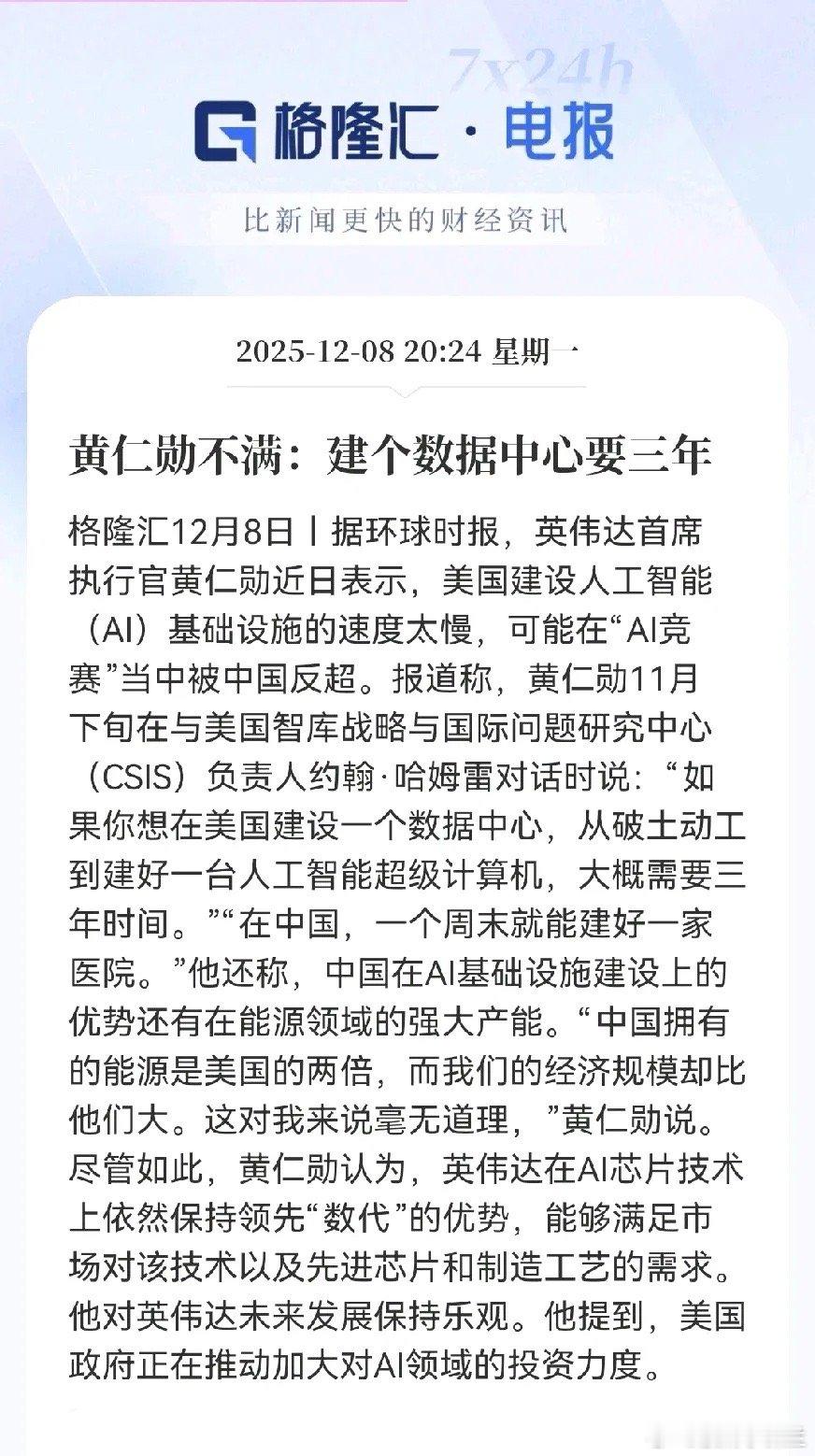 老黄这话说得挺有意思,明面上是夸中国,基建狂魔效率高、电费便宜,实际上是在对老美自己开炮,催着国内赶紧加速!核心就两点,第一,急啊!老美那边审批流程太慢,等个数据中心要三年,而技术迭代这么快,市场等不起;第二,虽然我们盖房子慢,但英伟达手里的芯片砖头还是最顶尖的,技术领先好几代,这是咱的底气!说白了,这就是一手危机营销,既提醒市场快被追上了,又强调自家产品不可或缺。意思就是,各位甲方爸爸,别光吐槽我卖得贵,你们自己的配套设施也得跟上啊!