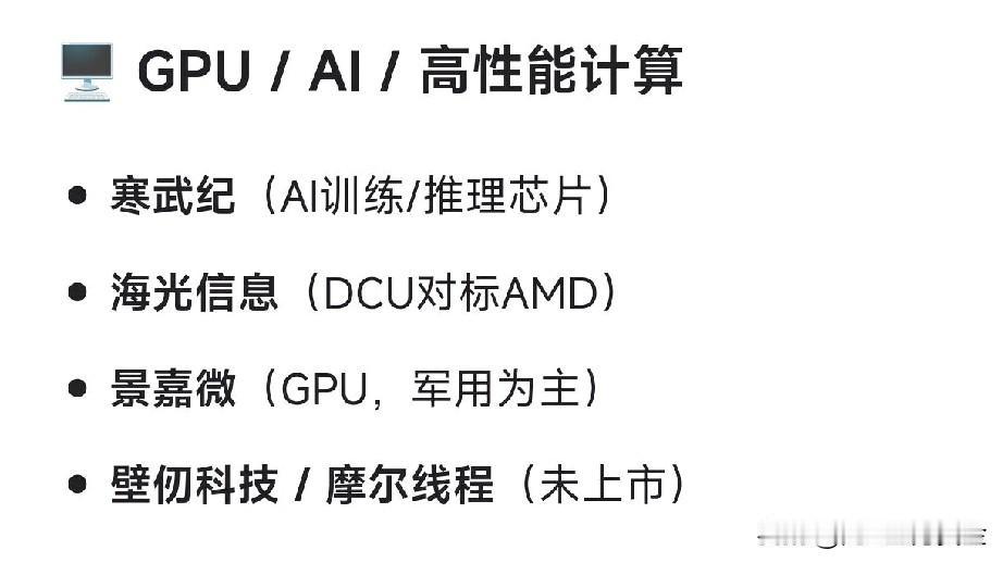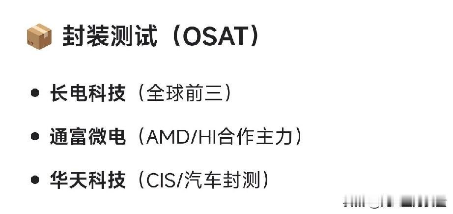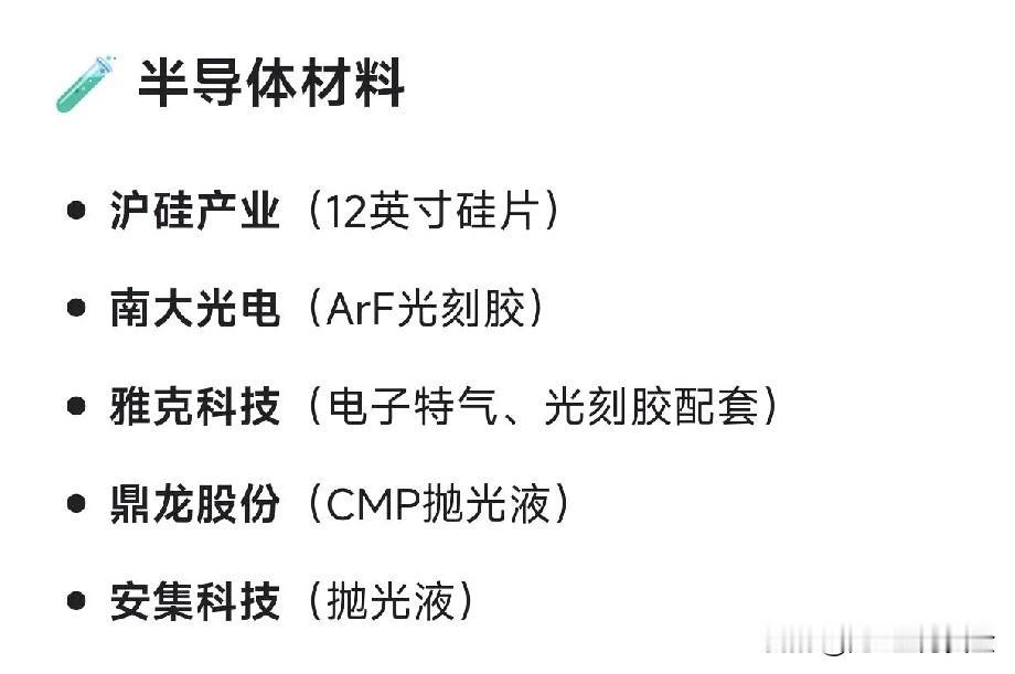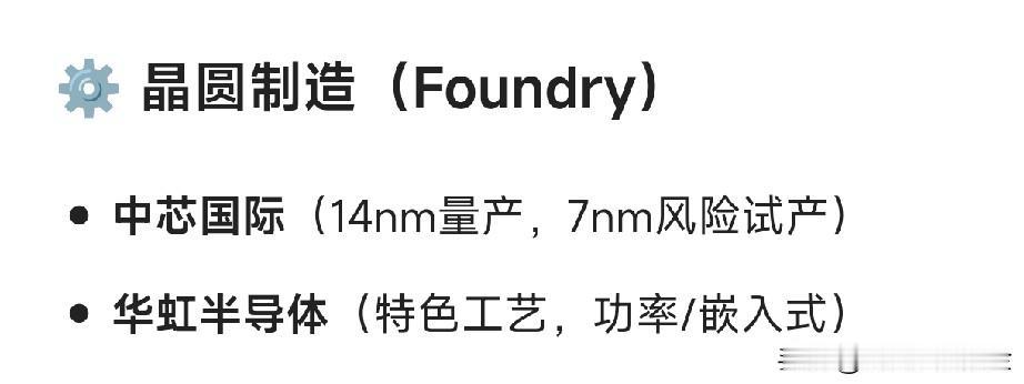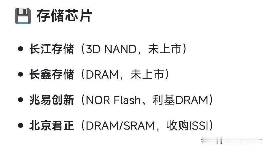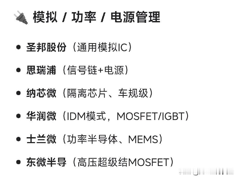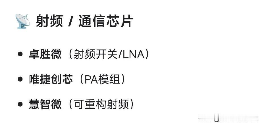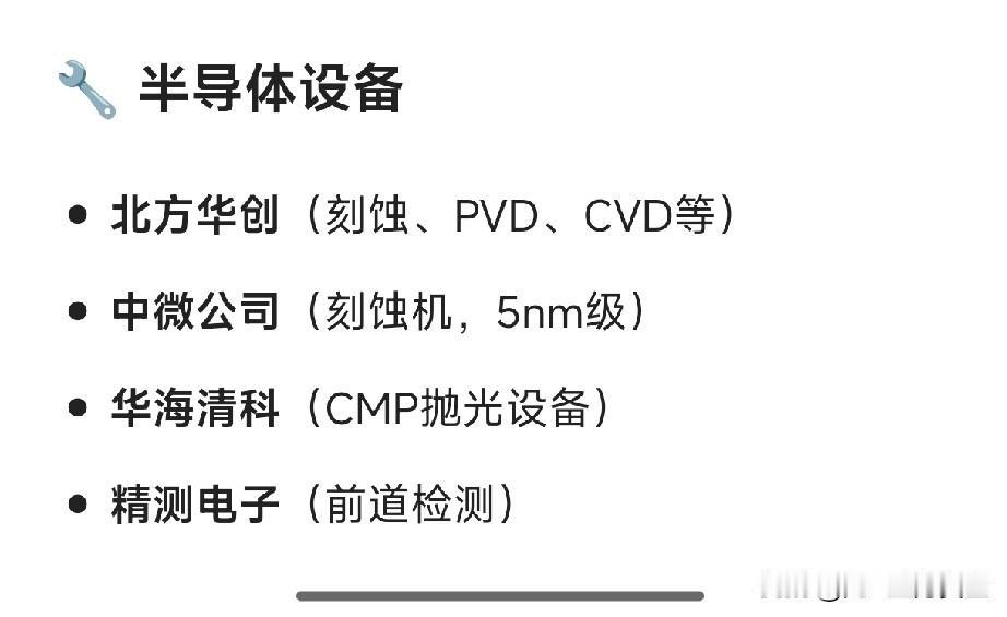 国产芯片概念各细分领域的龙头企业汇总: 芯片设计 华为海思(未上市) 紫光国微(FPGA、安全芯片) 兆易创新(NOR Flash、MCU) 韦尔股份(CIS图像传感器) 卓胜微(射频前端) 寒武纪(AI芯片) 澜起科技(内存接口芯片) 海光信息(CPU/GPU) ⚙️ 晶圆制造(Foundry) 中芯国际(14nm量产,7nm风险试产) 华虹半导体(特色工艺,功率/嵌入式) 🔧 半导体设备 北方华创(刻蚀、PVD、CVD等) 中微公司(刻蚀机,5nm级) 华海清科(CMP抛光设备) 精测电子(前道检测) 拓荆科技(薄膜沉积) 📦 封装测试(OSAT) 长电科技(全球前三) 通富微电(AMD/HI合作主力) 华天科技(CIS/汽车封测) 🧪 半导体材料 沪硅产业(12英寸硅片) 南大光电(ArF光刻胶) 雅克科技(电子特气、光刻胶配套) 鼎龙股份(CMP抛光液) 安集科技(抛光液) 💾 存储芯片 长江存储(3D NAND,未上市) 长鑫存储(DRAM,未上市) 兆易创新(NOR Flash、利基DRAM) 北京君正(DRAM/SRAM,收购ISSI) 🔌模拟 / 功率 / 电源管理 圣邦股份(通用模拟IC) 思瑞浦(信号链+电源) 纳芯微(隔离芯片、车规级) 华润微(IDM模式,MOSFET/IGBT) 士兰微(功率半导体、MEMS) 东微半导(高压超级结MOSFET) 📡 射频 / 通信芯片 卓胜微(射频开关/LNA) 唯捷创芯(PA模组) 慧智微(可重构射频) GPU / AI / 高性能计算 寒武纪(AI训练/推理芯片) 海光信息(DCU对标AMD) 景嘉微(GPU,军用为主) 壁仞科技 / 摩尔线程(未上市)