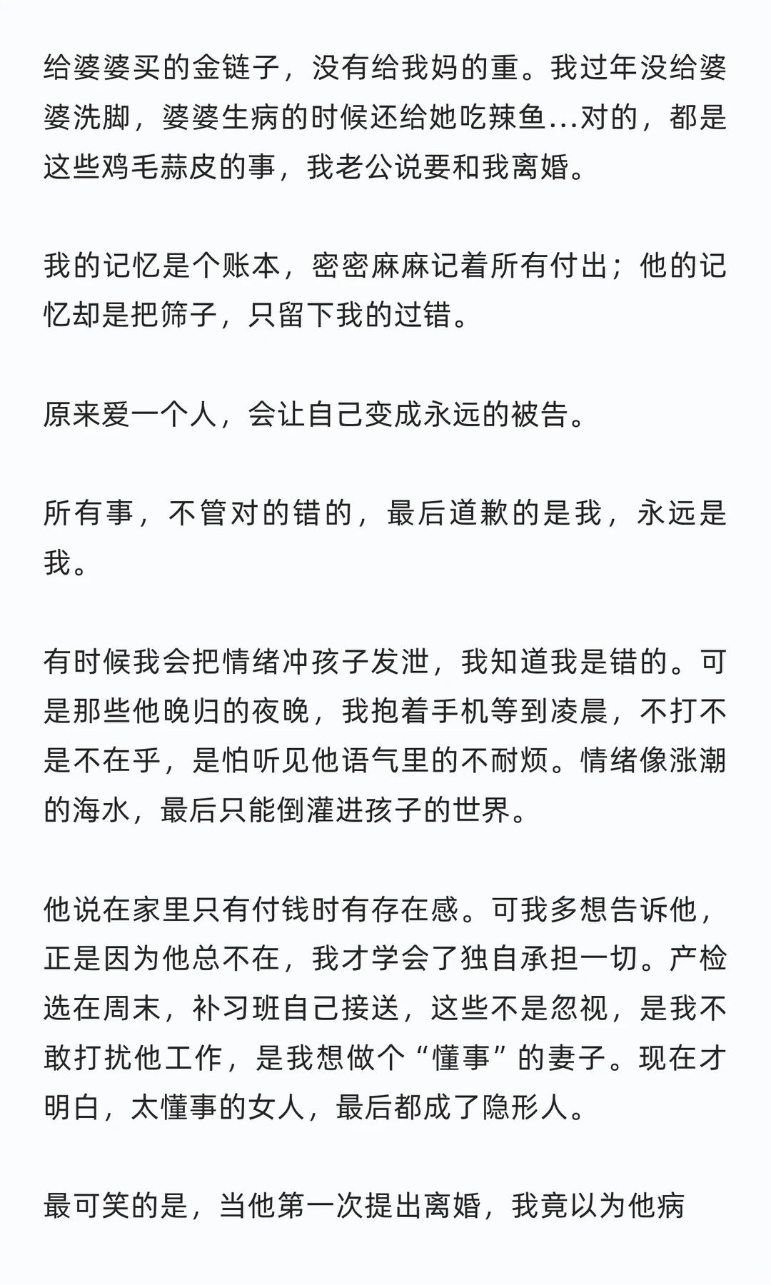 他离婚的决心里,全是我的错啊。给婆婆买的金链子,没有给我妈的重。我过年没给婆婆洗脚,婆婆生病的时候还给她吃辣鱼…对的,都是这些鸡毛蒜皮的事,我老公说要和我离婚。 我的记忆是个账本,密密麻麻记着所有付出;他的记忆却是把筛子,只留下我的过错。 原来爱一个人,会让自己变成永远的被告。 所有事,不管对的错的,最后道歉的是我,永远是我。 有时候我会把情绪冲孩子发泄,我知道我是错的。可是那些他晚归的夜晚,我抱着手机等到凌晨,不打不是不在乎,是怕听见他语气里的不耐烦。情绪像涨潮的海水,最后只能倒灌进孩子的