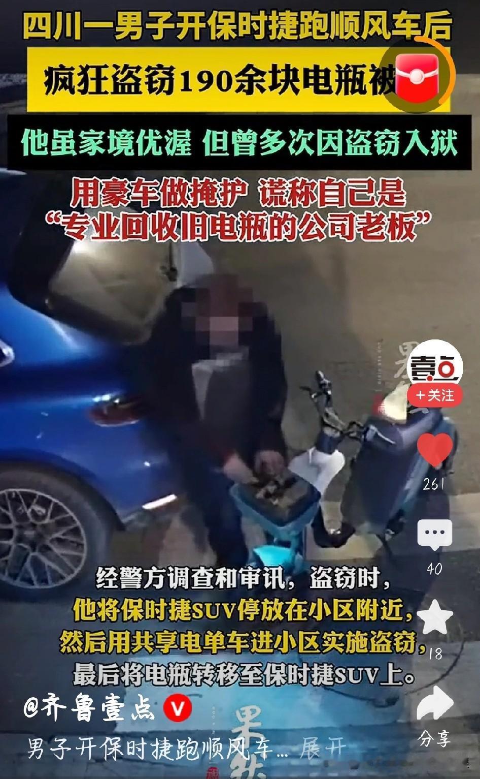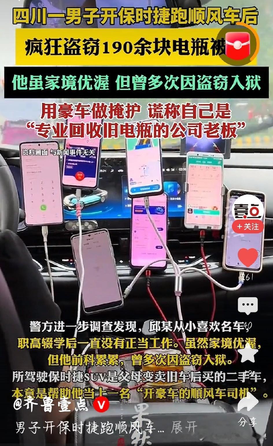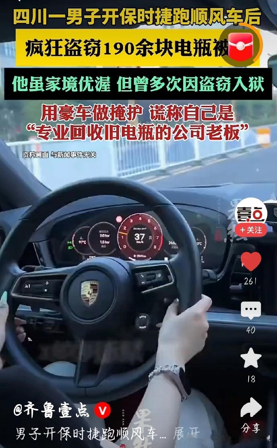 开保时捷跑顺风车,竟偷190块电瓶!这操作太离谱 四川资阳出了件荒唐事!20多岁的邱某开着保时捷跑顺风车,送完乘客竟连夜偷电瓶,一偷就是190块。 他把保时捷停在小区外,骑共享电单车进小区作案,拆了电瓶就往共享车筐里装,再运到豪车上,还盖雨衣伪装。这奇葩操作被保洁员发现,告诉保安后,保安追上去抢了他的车钥匙,可他趁着车没熄火还是跑了。 警方追了1个多小时,终于把他抓住。原来这车是他爸妈卖了旧车,花10多万买的二手车,想让他好好跑顺风车过日子,没成想他是惯偷,之前就因盗窃坐过牢,还谎称自己是回收老板卖赃物。 放着好日子不过偏走歪路,真是白瞎了父母的苦心!你们见过这么离谱的事吗? 男子开保时捷跑顺风车 偷190块电瓶 保时捷司机偷电瓶 离谱新闻 图片截图于网络