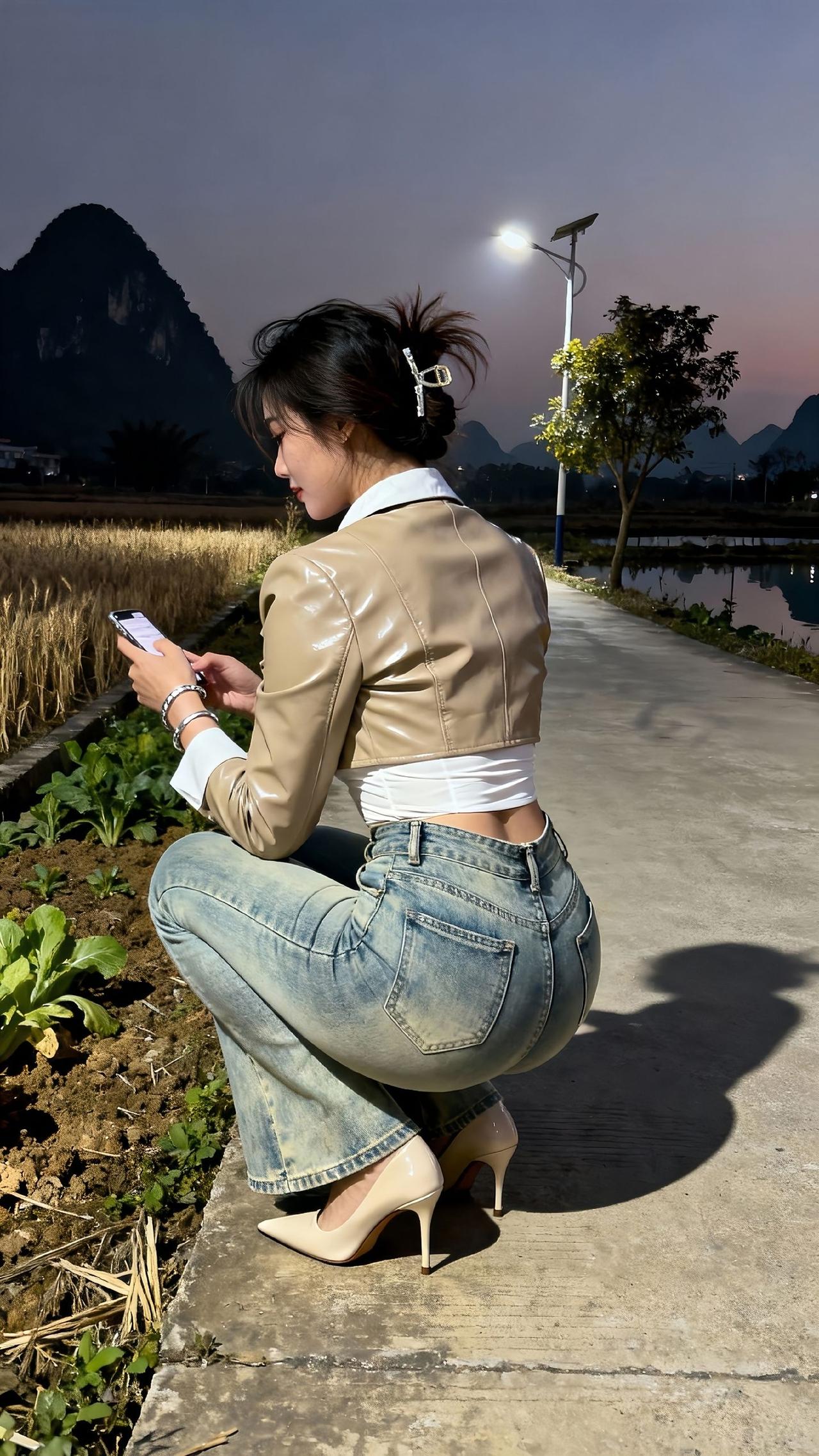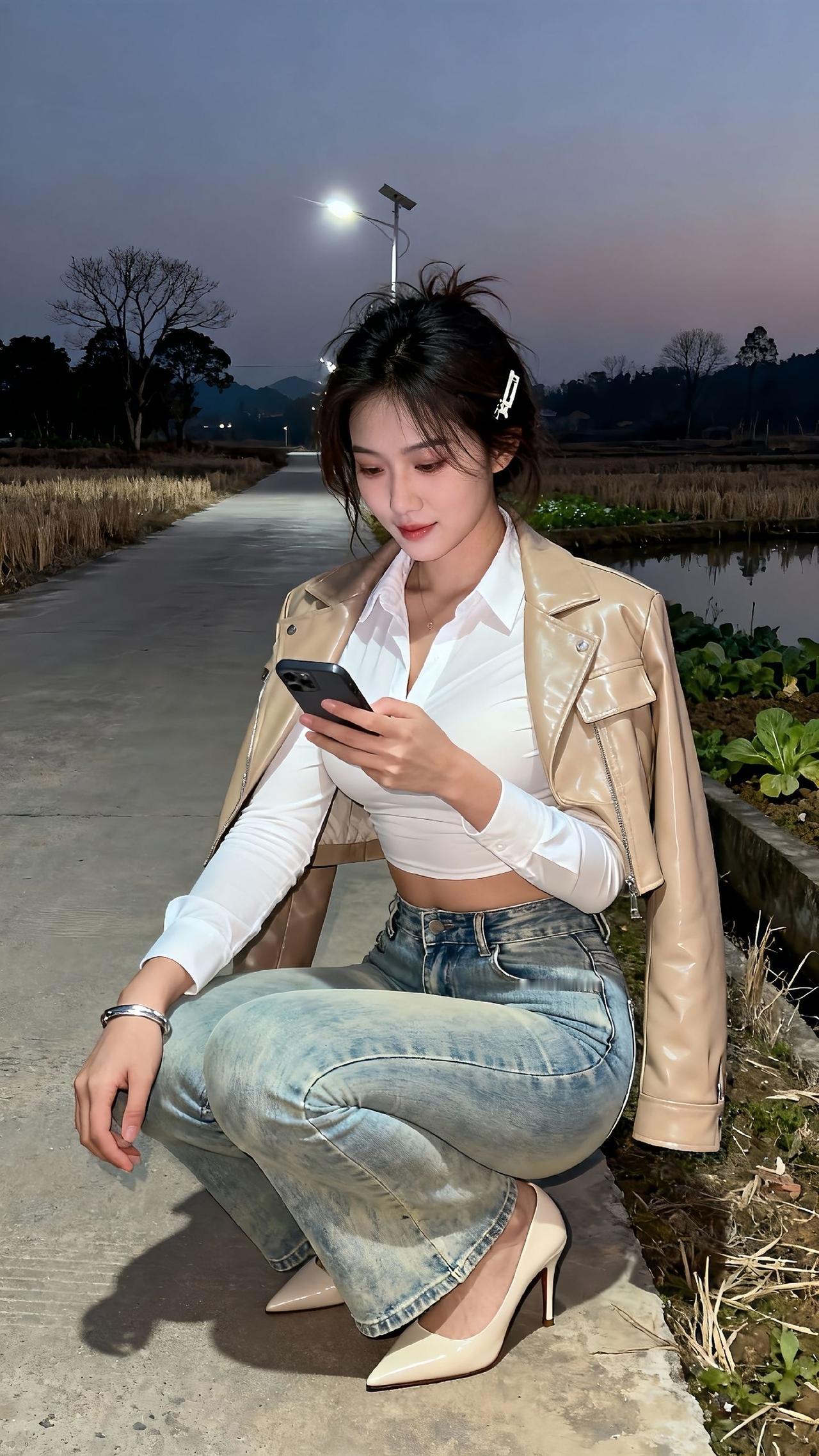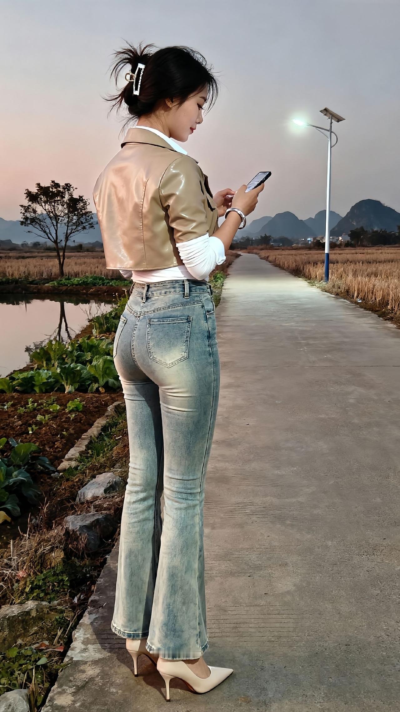 第4集穿搭分享 卡其皮夹克叠穿白衬衫,配做旧微喇牛仔+裸色高跟,把都市精致揉进田埂晚风里 皮夹克的飒、衬衫的柔、牛仔的随性,被裸跟鞋一衬,又辣又温柔——连路边菜畦都在偷看这波混搭~ 卡其短款皮夹克 做旧微喇牛仔 乡野轻熟风