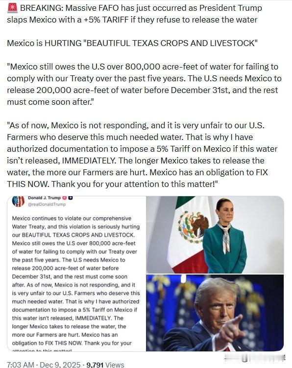 突发:川普总统刚刚发出“FAFO”大招——如果墨西哥拒绝放水,美国将立即对其实施 +5% 关税。 “墨西哥正在伤害我们德州美丽的庄稼和牲畜!” “过去五年,墨西哥一直未履行我们的《水资源条约》,累计欠美国超过 80 万英亩英尺的水。 美国要求墨西哥在 12 月 31 日前先释放 20 万英亩英尺,其余也必须尽快到位! 截至目前,墨西哥仍未回应,这对我们急需用水的美国农民极不公平。 因此,我已授权文件:如果墨西哥不立即放水,美国将对其实施 5% 关税。 墨西哥拖得越久,我们的农民就越受伤。 墨西哥必须立刻解决!谢谢大家关注此事!”