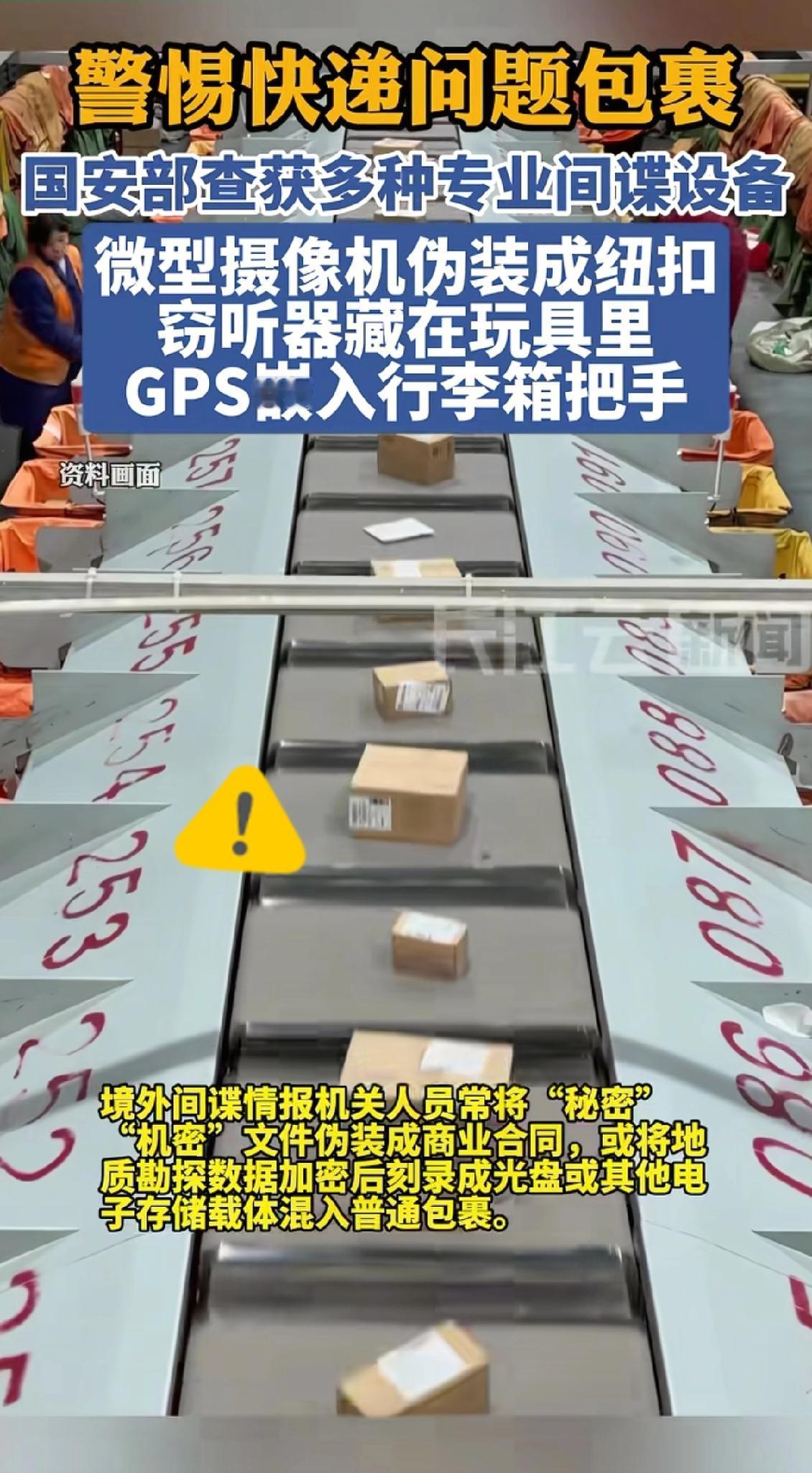 认真对待! 谨防身边的问题包裹! 国安部12月8日发布《问题包裹严查验》,明确近年间谍设备查获量越来越多。 像伪装成纽扣的微型摄像机、藏在玩具里的窃听器、嵌入行李箱把手的GPS追踪器。 我们试着想想出差时,行李箱被装追踪器,行踪可能被泄露,多吓人啊。 境外间谍还会搞网络攻击,用恶意软件偷敏感信息,也会给我们造成不小的损失。 他们的活动不局限军事,经济、科技领域均有渗透,商业机密泄露可能影响国家经济。 学校也成重点目标,间谍通过学生获取科研成果,学校需加强安全管理。 如今,社交媒体也成间谍活动新“战场”,他们伪装成普通网友拉信任,甚至潜入团队。 真觉得间谍离咱们一点不远!纽扣藏摄像头、玩具装窃听器,出差时行李箱可能被装追踪器,连社交媒体上都有伪装的间谍。 还有境外的人盯高校学生、搞网络攻击,太隐蔽了,国家提醒咱们大家这件事情千万别大意。 发现可疑的赶紧打12339举报,护自己也护国家,可不能等信息漏了才后悔。 大家怎么看这件事,欢迎评论区讨论一下。央视曝光间谍案