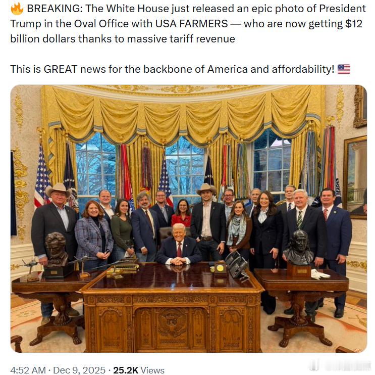 特朗普总统在椭圆形办公室会见美国农民 —— 他们现在将因巨额关税收入而获得120亿美元的支持。这对美国的中坚力量与全美的生活负担来说,都是极好的消息!