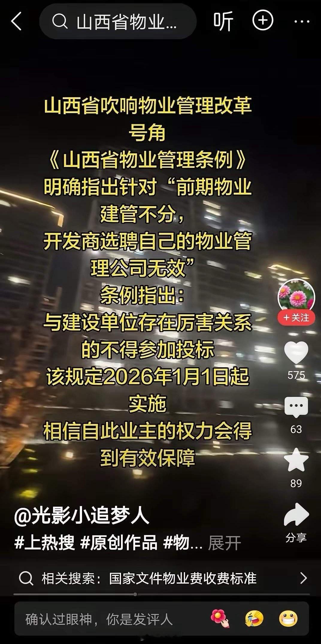 物业要变天了。昨天新闻已经报道了,山西省物业从2026年1月1日起,执行新的物业管理条例。前期物业公司无效。开发商招聘自己的物业公司无效。与开发商存在某些关系的物业公司无效。山西这一做法,在全国带了个好头。山西省的这一做法,真是全国民众的最关心的事情。物业公司的好日子就要结束了。有网友说:应该成立专门机构对全国的物业公司进行审计查账,而且深入业主开展调查摸底,接受举报线索,查清收入支出,取消物业和业主委员会连裆裤现象,私分贪污提取物业费行为应该有人管了。还有网友表示:有多少为贪官污吏,利用物业提供黑钱,提供方便,提供一切便利,山西这一措施很及时很果断,很正气,很顺民意。