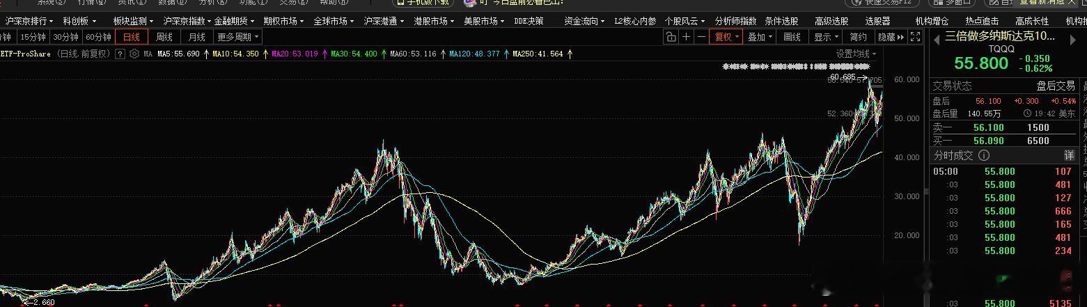在“崩溃”中悄悄涨了18倍三倍做多纳斯达克100ETF,从2018年最低2.66一路飙升至目前55.8美元,充分展现了长期持有的魅力,拿着不动一路躺赢,当然前提是要对美国的未来充满信心,中途也有很多次较大回调,如果试图规避这些风险,我想收益也会大打折扣7年18倍什么水平 股神