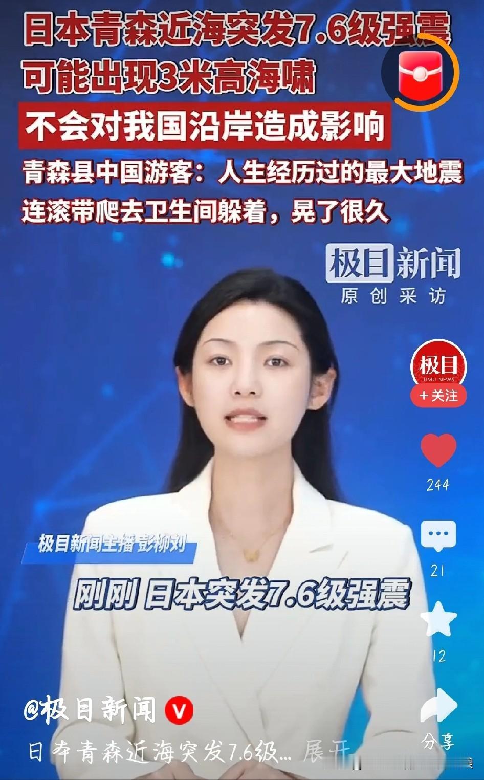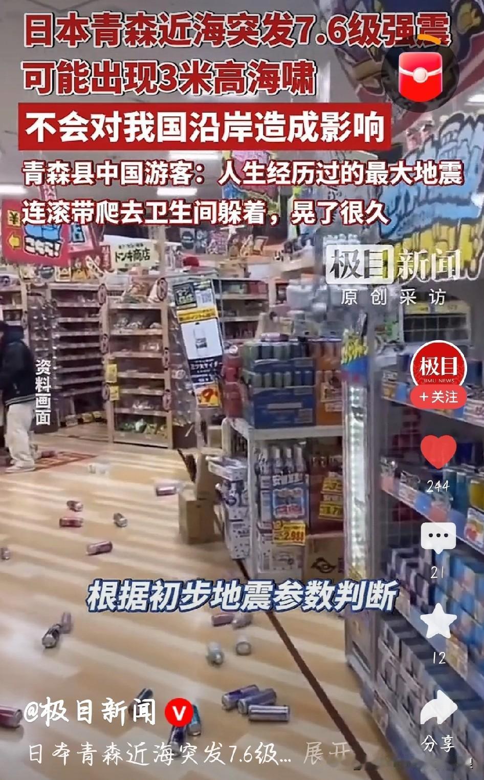 日本强震吓懵中国游客!连滚带爬躲厕所,晃得站不稳 北京时间12月8号晚上10点多,日本突发7.5级强震,在当地的中国游客吓得不轻! 青森县一位游客说,当时电子设备全在报警,整栋楼晃得厉害,他在酒店3楼,直接连滚带爬躲进卫生间,死死抱住马桶才稳住,晃了好久才停,之后赶紧穿衣服下楼。北海道的游客也说,楼晃得站不住,所有人都从楼梯跑下来,电梯早就停了。 还有华人穿秋裤就往外冲,结果外面零下2℃冻得又回去了。这次地震还发了海啸预警,超10万人要避难,青森县不少人受伤、停电,还有地方着火了。 中国使馆已经提醒大家躲着海边,遵守避难指令。出门在外遇到这事儿太吓人,你们觉得遇到地震该先躲还是先跑? 地震对日本核污染水排海有何影响 日本地震预警系统是否足够先进 在日中国游客称“连滚带爬躲厕所” 日本地震海啸 图片截图于网络