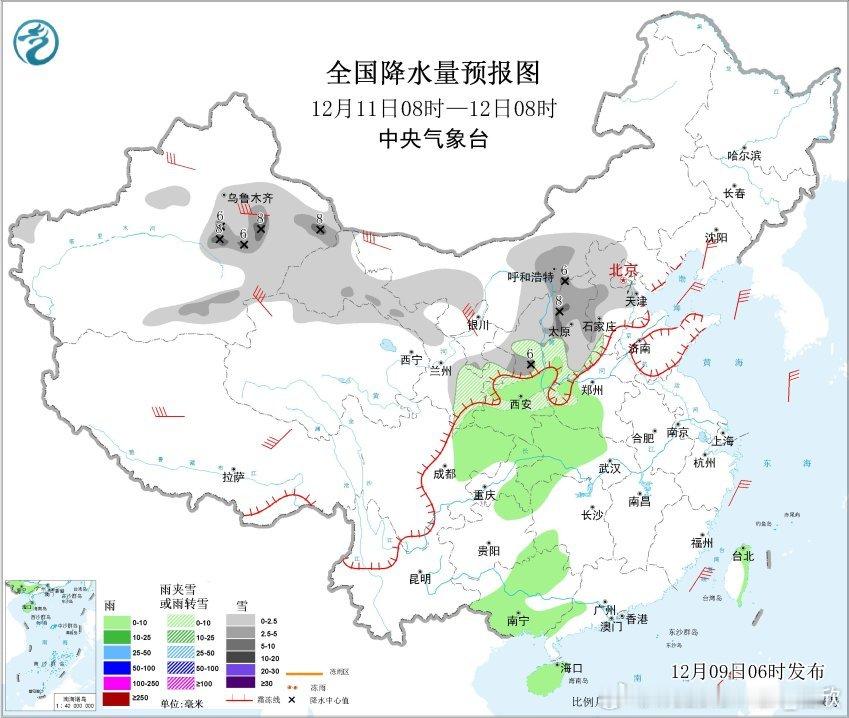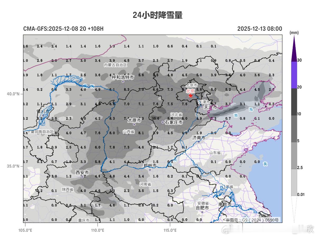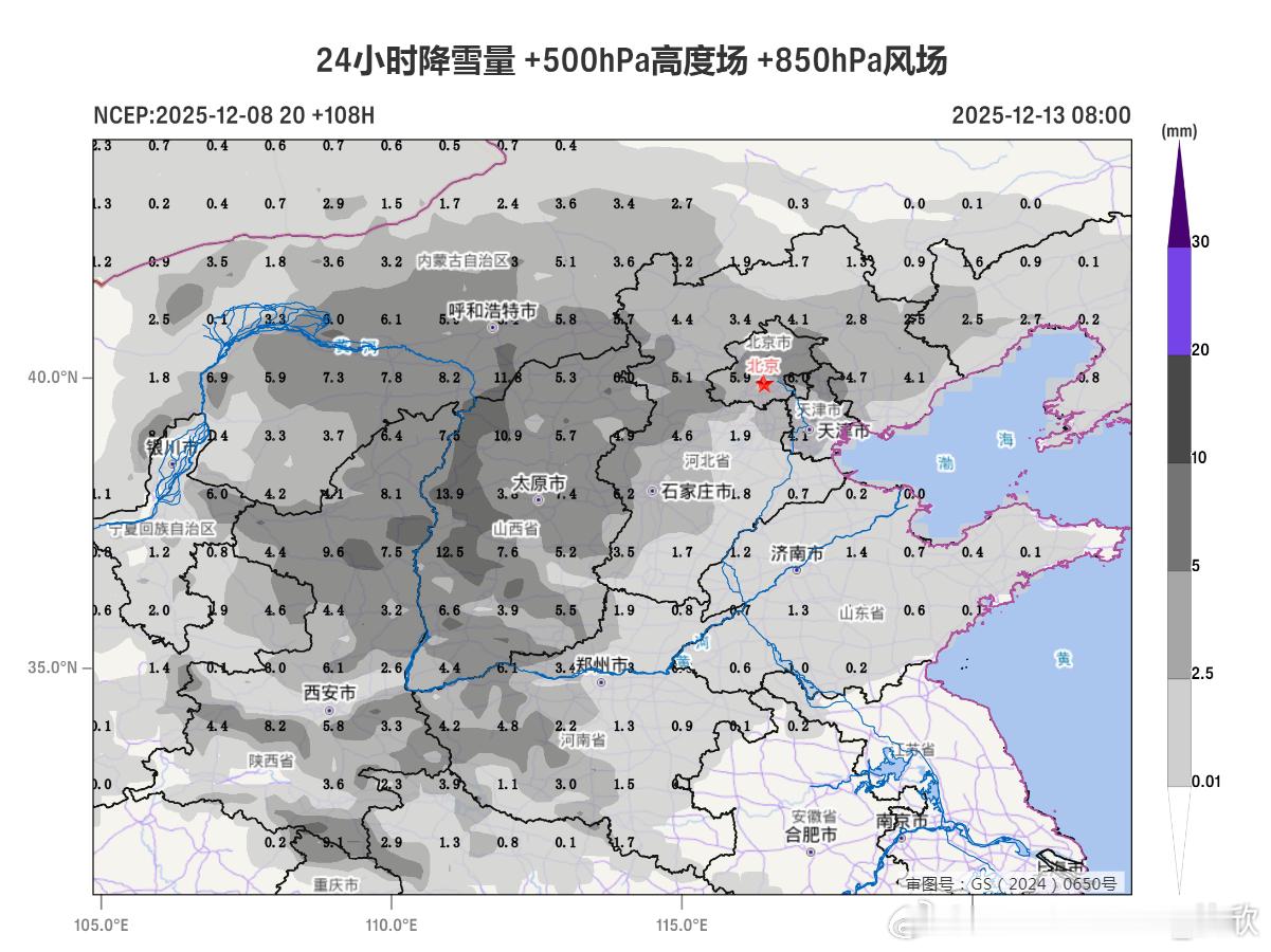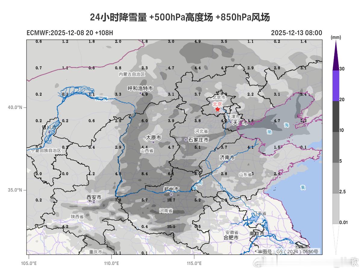 【11-13日中东部大范围降水】11-13日,高空槽携带冷空气东移南下,同时南支槽前有大量暖湿气流北上,冷暖空气交汇导致中东部有大范围雨雪。其中12日08时-13日08时,华北、黄淮北部等地可能出现明显降雪,但降雪强度在不同数值模式上,依然有分歧,图7-9为我国、欧洲、美国数值的降雪量预报。