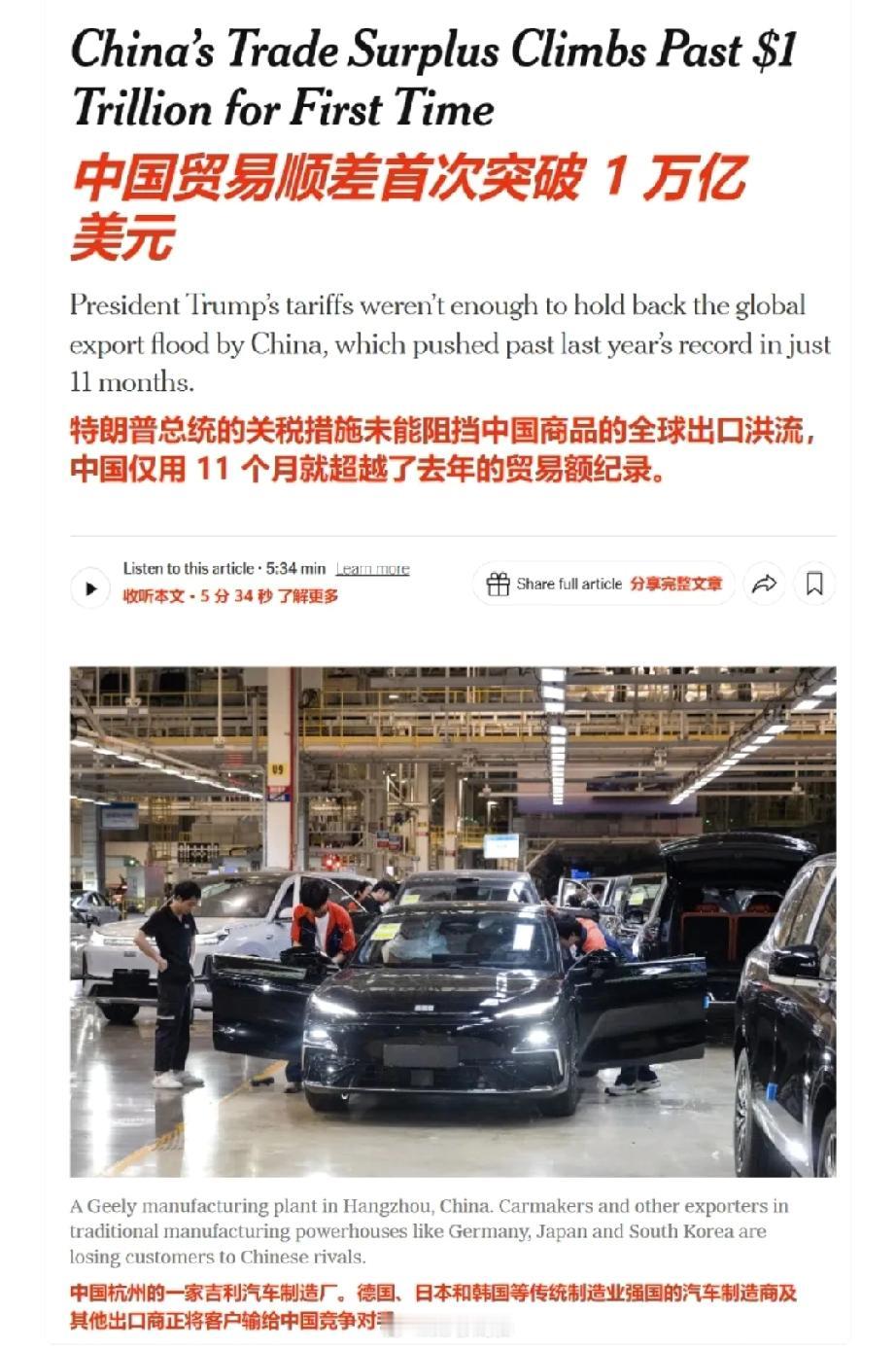 特朗普的关税措施就像纸老虎,根本阻挡不了中国商品在全球的步伐。纽约时报都承认,咱们仅用11个月贸易顺差就首次突破1万亿美元,再次超去年纪录。 此前特朗普政府掀起贸易战,还不断施压加征关税,想限制中国出口。可结果呢?7月我国货物出口总额达3.91万亿人民币,同比大幅增长。过去7个月数据也超预期,贸易顺差来到创纪录的6835亿美元。而且因为特朗普威胁加税,中美商家都提前行动,促进了中国出口。事实证明,中国外贸韧性十足,特朗普的小算盘注定打不响。