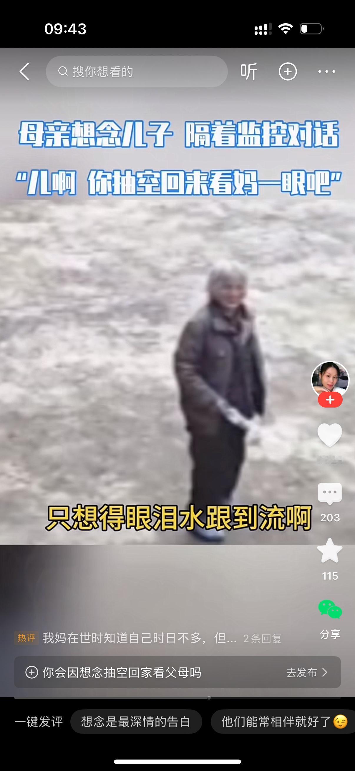 老家的母亲想念儿子,隔着监控喊话,儿子,你抽空回来看妈一眼吧。妈想你想得眼泪水跟到流啊。妈知道你们在外面工作辛苦,妈到底还能活到好多年啊?是啊,老人家一个人孤苦伶仃的在家里,没有人说话,没有人照顾,太惨了。儿子在外面就算赚再多钱又有何意义?
