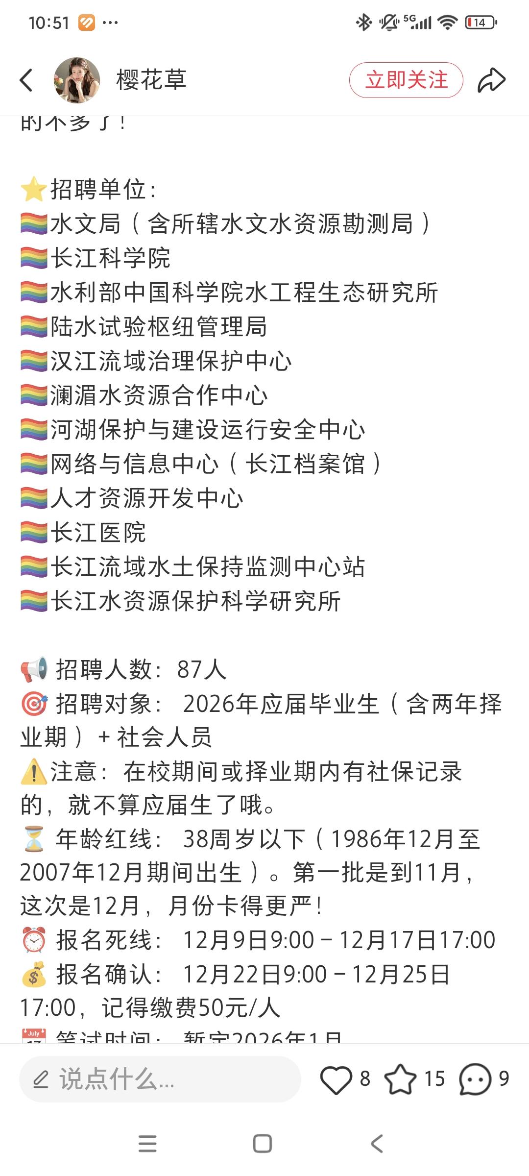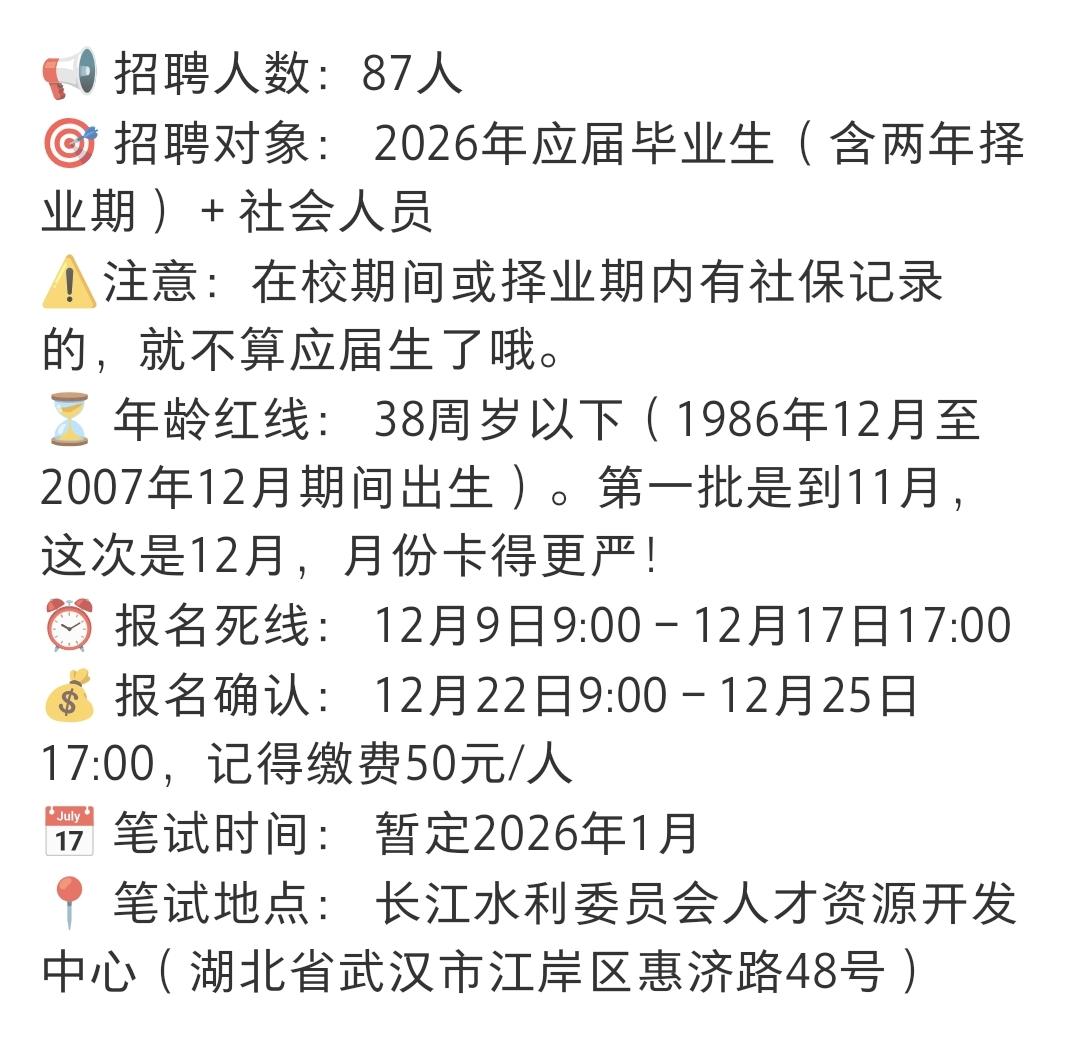 2026水利部长江水利委员会事业单位招聘87人,38周岁以下可报。报名时间:12月9日-12月17日笔试时间:26年1月。