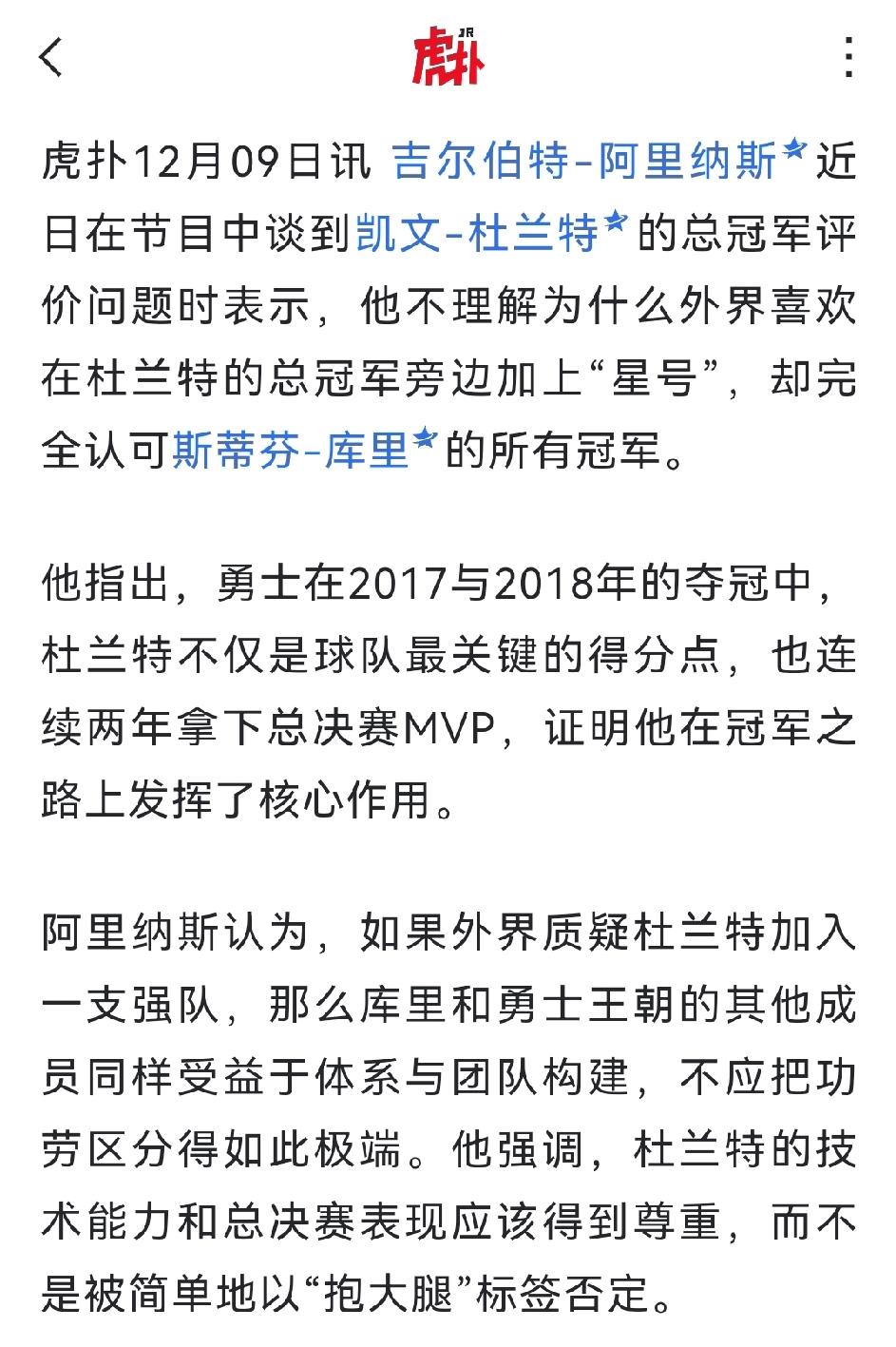 阿里纳斯你是真行,没有流量了硬找话题蹭杜兰特、库里热度…… 他又想借此掀起库杜蜜的网络辩论赛是吧! 近日大将军阿里纳斯在自己直播节目中表示,他非常不理解为什么这么多人不认可杜兰特在勇士夺冠时的老大地位。 大将军说,在2017与2018赛季的夺冠历程中,杜兰特不仅是勇士队最关键的得分点,更是连续两年获得FMVP,这些足以证明他在夺冠过程中不可替代的运用。 阿里纳斯认为,外界不应该如此双标对待杜兰特,更不应该把功劳区分得如此极端。他强调,杜兰特的技术能力和总决赛表现应该得到尊重,而不是被简单地以“抱大腿”标签否定。 大家伙对这事怎么看啊?