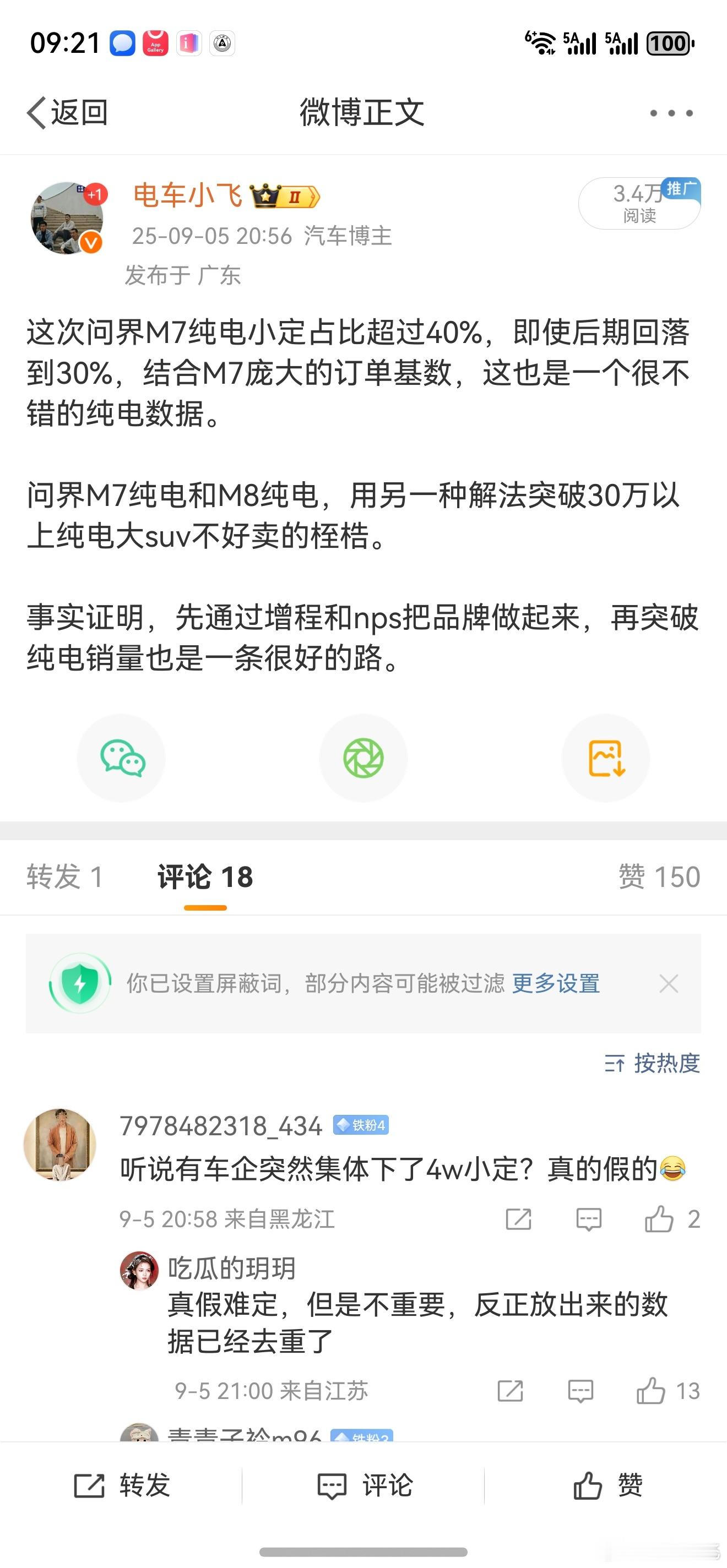 鸿蒙智行纯电月销量也突破3万辆了。尊界的纯电版居然有661辆。这还是问界M7和享界S9受限于100度巨鲸电池包产能问题的结果,如果100度巨鲸电池包敞开了供应,估计M7的纯电月销量能上万。