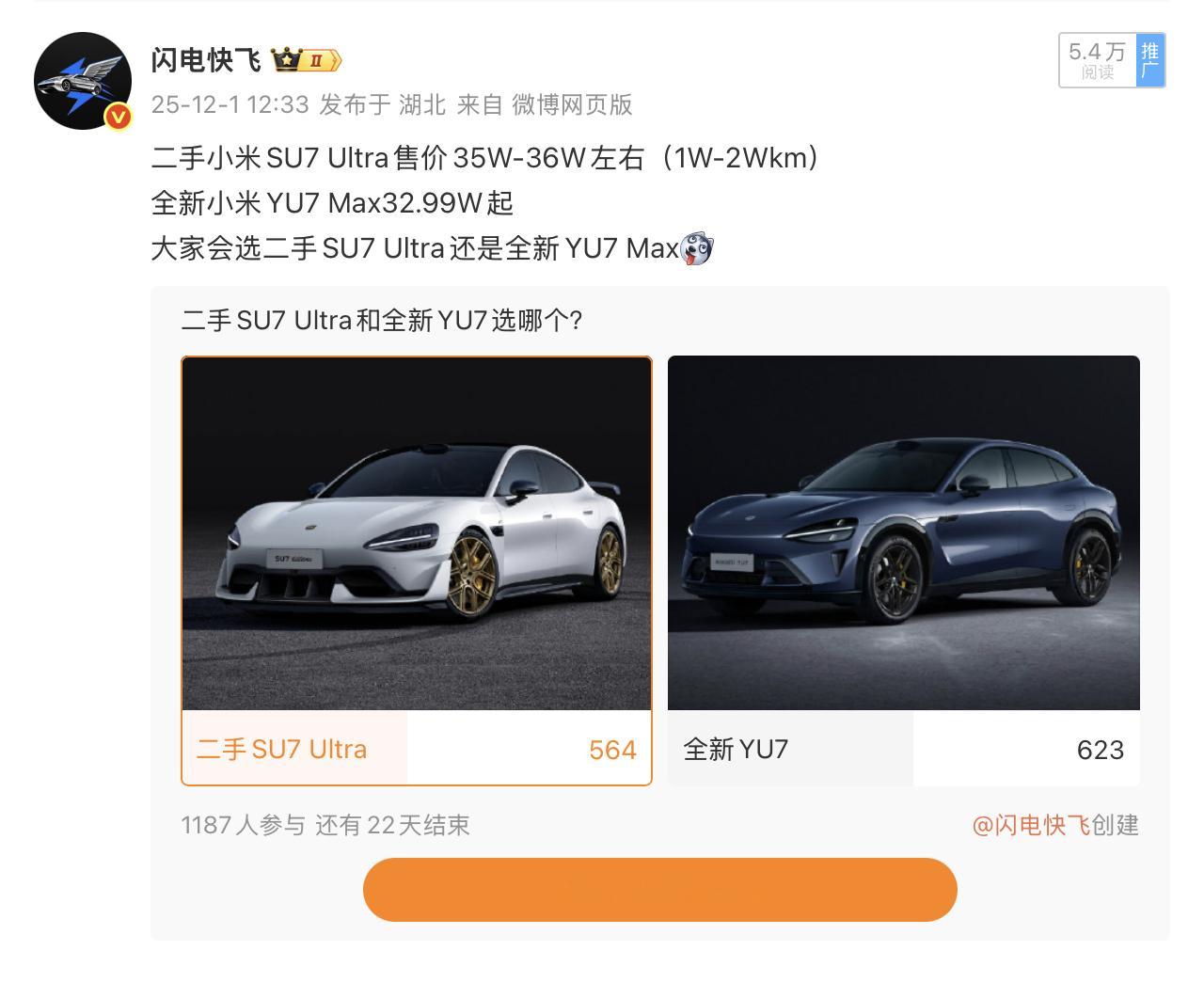 前几天发了一条投票二手SU7 Ultra和YU7 Max已经产生价格重叠了没想到两辆车投票的差距这么小二手SU7 Ultra能跌到不到40真的很香啊