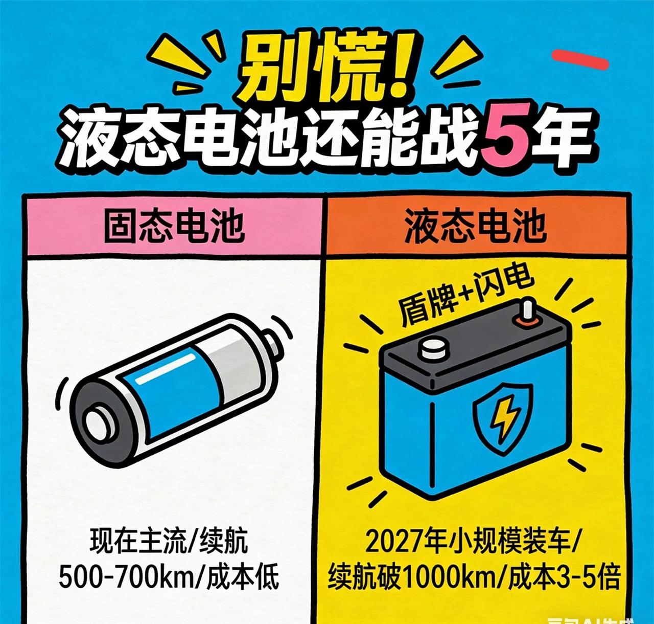 未来3-5年买车要等?固态电池要来了,但液态电车真成废铜了? 最近总刷到“固态电池一上,液态电车变废铜”的说法,还说未来汽车要大降价,作为蹲车半年的人特意扒了圈行业消息,发现真相没那么极端,但买车时机确实有讲究! 先说说大家最关心的降价,短期还真有可能降。现在汽车库存都堆到350万辆了,消化周期要57天,车企只能靠降价走量,燃油车终端优惠普遍10%-30%,新能源车2024年平均降了1.8万,2025年估计还得降5%-8% 。像比亚迪秦PLUS DM-i这类车,随着电池成本下降,价格说不定还能下探 。不过别光高兴,2027年后可能就分化了,国七排放标准一来,燃油车成本得加几千到一万多,到时候说不定要涨价 。 再聊聊被吹上天的固态电池,确实是大趋势,但没那么快普及。比亚迪、广汽这些车企都定了时间表,基本是2026-2027年开始装车测试,2030年才大规模商业化 。现在实验室里的样品是厉害,续航能破1000公里,还能解决自燃问题 ,但量产难啊,界面接触、成本控制都是坎儿,目前成本是液态电池的3-5倍 ,初期肯定先装在高端车上,比如蔚来ET9起售价可能突破80万 ,普通人想买便宜的还得等。 至于“液态电车变废铜”,有点夸张了。2027年才小规模量产,前期价格贵,中低端市场还是液态电池的天下 。而且现在的车一般开5-8年换,等2030年固态电池普及,刚好到换车周期,自然迭代就行 。但要注意,未来液态电车的保值率肯定会跌,尤其是续航低于600公里的车型 ,想长期开或者在意残值的得慎重。 给纠结买车的朋友提个醒:要是不急着用,能等到2030年最好,那时固态电池成本下来了,体验也更成熟 。但千万别碰边缘品牌,降价快还可能没售后。