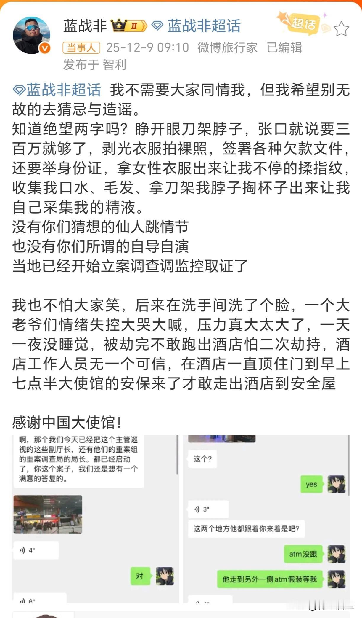 千万粉丝博主,走遍七大洲都没事,结果在国外,差点被自己人给绑了。 据说对方半年前就盯上他了,买通机组人员搞到了航班信息。先是在机场假扮粉丝,并提前安排了三辆假出租车等着他。还好他警惕,选了正规出租车,躲过一劫。 前期计划失败后。对方随后买通了他入住的五星级酒店员工,半夜直接刷卡进了他房间。逼着他转账、借网贷,还收集他的头发、指纹,打算伪造强奸案件陷害他。最后撂下话,早上八点前必须离开南非,否则后果自负。 这事听着都后怕。真是应了那句老话,出门在外,有时候最该警惕的,反而是那些最“熟悉”的面孔。防止老乡见老乡,背后开一枪。