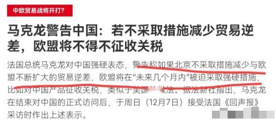 简直不敢相信,这话是从马克龙口中说出来!刚访华结束,马克龙口风变得非常强硬!12月7日,根据法新社报道,法国总统马克龙接受采访时表示,如果北京不采取措施减少与欧盟不断扩大的贸易逆差,欧盟将在“未来几个月内”被迫采取强硬措施,比如对中国产品征收关税,类似于美国的做法。 马克龙声称:中国正在“冲击”欧洲工业和创新模式的核心,而欧洲的传统优势在于机床和汽车工业。为了减少与中国的贸易逆差,欧洲必须接受中国的投资。我们不能一直进口,中国企业必须来欧洲投资。中国在欧洲的投资不应具有“掠夺性”,即不能以追求霸权和制造依赖为目的。 马克龙刚结束访华就换了副口气,喊着要对中国产品加关税,还说中国“冲击”欧洲工业,这操作确实让人摸不着头脑。 就看他口中的贸易逆差,2024年欧盟对华出口约2130亿欧元,中国对欧出口却达5190亿欧元,3000多亿欧元的逆差看着扎眼,但这真不是中国单方面造成的。 就说欧洲引以为傲的机床工业,瑞士曾是高端机床的代名词,2020年中国买的瑞士高端数控机床占了他们出口的30%,可后来瑞士跟着美国搞断供,结果2025年一季度对华出口直接暴跌37%,五家百年老牌厂商裁员停产,反而让德国、日本企业趁虚而入。 这哪是中国不进口,分明是欧洲自己把到手的订单推出去,转头还怪别人不买,未免太不讲理了。 还有中国投资,马克龙一边要求中国企业去欧洲投资,一边又给扣上“掠夺性”的帽子,这简直是又想要又怕烫。 看看斯洛伐克的情况,中国已经是当地欧盟以外最大的贸易伙伴,中企在那投资超6亿美元,创造了5000多个就业岗位,华为、福耀玻璃这些企业早就扎下根来,国轩高科还砸了12.33亿欧元合资建电池工厂,光这一个项目就要带动1300人就业。 这些投资带来的是实实在在的产能和工作机会,哪里是什么“制造依赖”,分明是欧洲自己竞争力不足,却想把锅甩给中国。 毕竟中国工业产值早在2021年就超过了G7国家总和,欧洲要是真有底气,也不会盯着中国投资不放,又怕又盼的样子实在有点矛盾。 至于欧洲的汽车工业,马克龙把它当成传统优势,可实际情况是欧盟2024年新注册的纯电动汽车反而比2023年下降了6.1%,虽然保有量还在增长,但增长势头已经放缓。 反观中国企业,不仅在欧洲投资建厂,还通过中欧班列把零部件快速运到当地组装,斯洛伐克的汽车及零部件贸易额都达到了29.6亿美元,这明明是互补共赢,怎么就成了“冲击”? 而且有意思的是,欧盟一边喊着逆差,一边还在搞贸易保护,2025年11月刚对中国己二酸征收28.6%到46.8%的反倾销税,可中国己二酸2025年上半年出口量还激增26.36%,只是把出口目的地转到了土耳其、印度等地,欧盟本土企业反而因为失去中国供应链,巴斯夫都关停了德国的己二酸装置。 这种搬起石头砸自己脚的操作,说到底还是自身竞争力跟不上,不想着怎么提升技术、优化营商环境,反而寄希望于加关税,跟美国学那套贸易保护,显然找错了方向。 欧洲总说自己的核心优势在机床和汽车,可实际行动却一直在自废武功。 机床领域放着中国这个大市场不用,非要搞技术封锁;汽车领域在新能源转型上慢半拍,还想着用关税阻挡中国产品,结果只能是让自己的市场份额被慢慢侵蚀。 中国从来没有强迫欧洲进口,也没有阻拦欧洲企业来华,反而一直敞开大门,是欧洲自己把贸易和投资搞得政治化。 马克龙喊着“不能一直进口”,却忘了贸易是双向的,欧洲要是真能拿出有竞争力的产品,中国市场从来不会拒绝。 与其花时间琢磨怎么加关税、给中国投资贴标签,不如好好想想为什么本土产能会持续收缩,为什么企业会纷纷转向亚洲布局。 毕竟贸易逆差的根源从来不是别人太强,而是自己不够努力,把自身需要解决的问题甩给中国,既不客观,也解决不了任何问题。