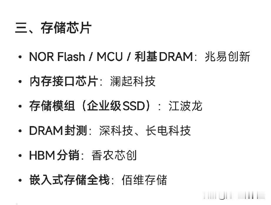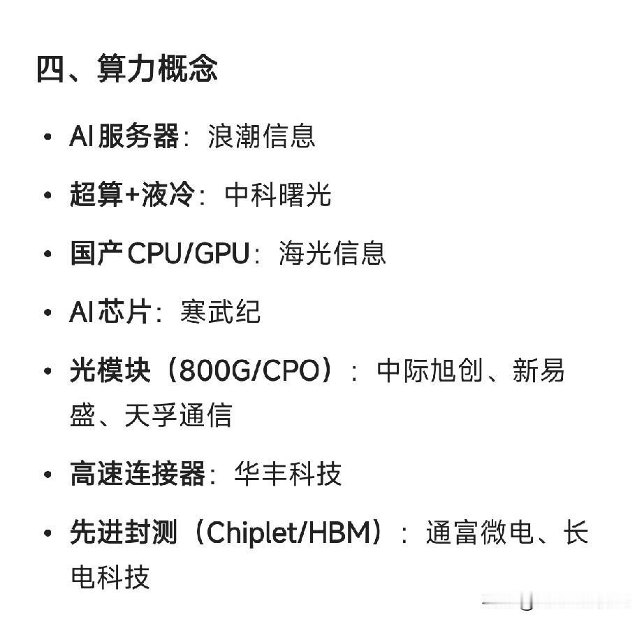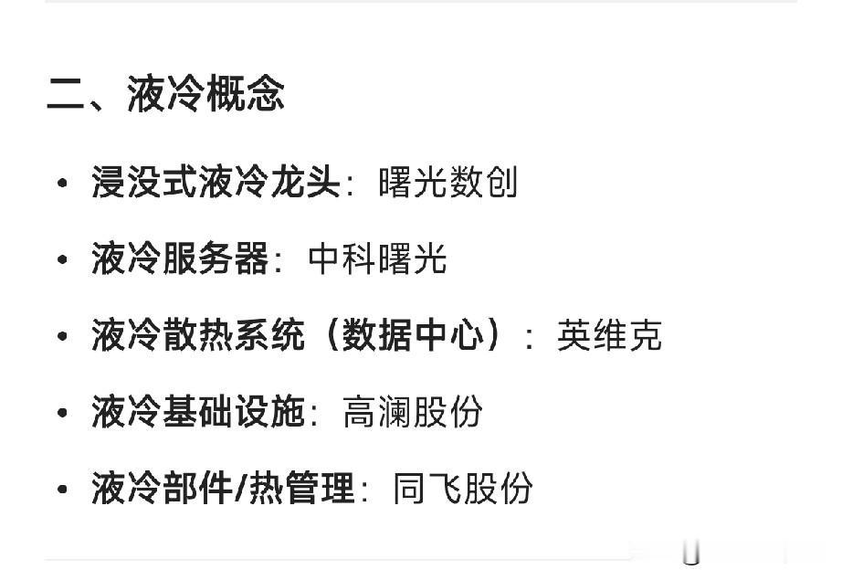 培育钻石、液冷概念、存储芯片、算力概念 四大方向的细分龙头企业汇总: 一、培育钻石 CVD法龙头:力量钻石 HPHT法龙头:中兵红箭 全产业链(HPHT+CVD):黄河旋风 压机设备龙头:国机精工 MPCVD设备+生产:沃尔德 消费品牌(零售):豫园股份、潮宏基 二、液冷概念 浸没式液冷龙头:曙光数创 液冷服务器:中科曙光 液冷散热系统(数据中心):英维克 液冷基础设施:高澜股份 液冷部件/热管理:同飞股份 三、存储芯片 NOR Flash / MCU / 利基DRAM:兆易创新 内存接口芯片:澜起科技 存储模组(企业级SSD):江波龙 DRAM封测:深科技、长电科技 HBM分销:香农芯创 嵌入式存储全栈:佰维存储 四、算力概念 AI服务器:浪潮信息 超算+液冷:中科曙光 国产CPU/GPU:海光信息 AI芯片:寒武纪 光模块(800G/CPO):中际旭创、新易盛、天孚通信 高速连接器:华丰科技 先进封测(Chiplet/HBM):通富微电、长电科技