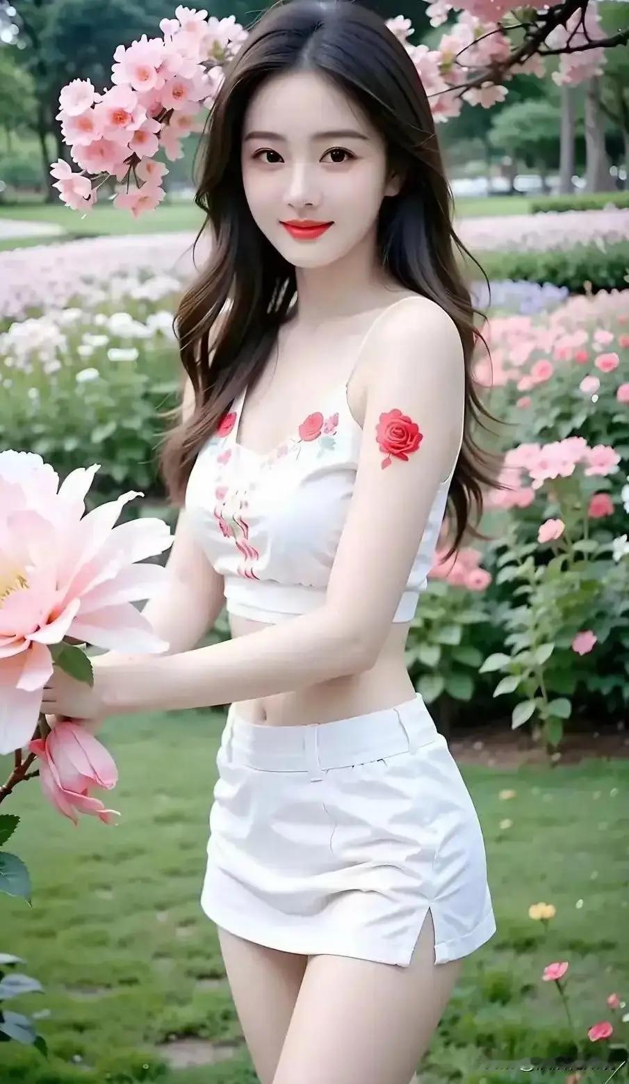 春日花海中的甜美少女,粉色花朵与白色裙装相映成趣,清新自然。