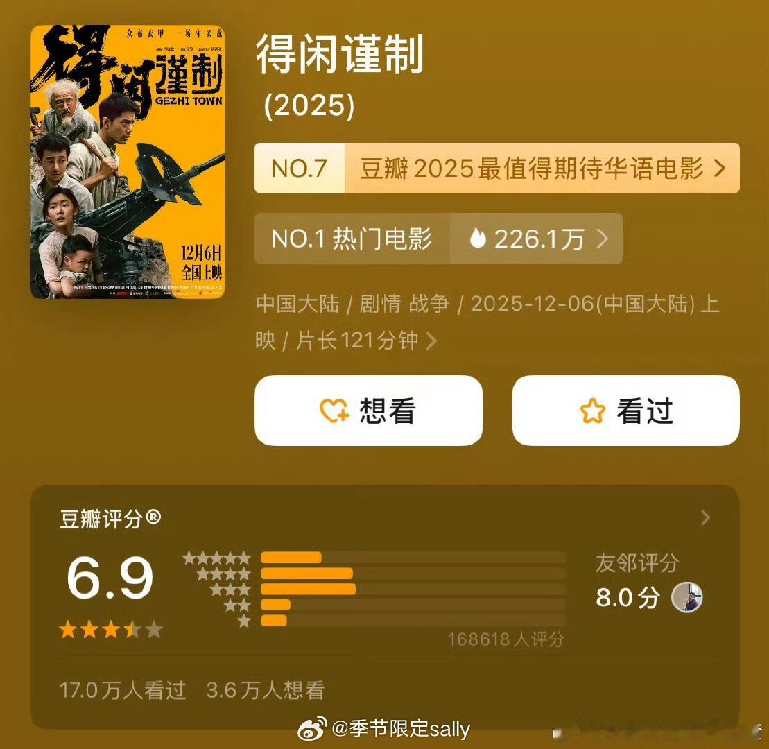 电影《得闲谨制》豆瓣开分6.9分,低了