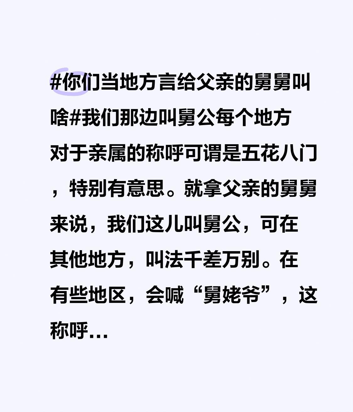 在有些地区,会喊“舅姥爷”,这称呼听起来就带着一股浓浓的北方味儿,让人感觉特别亲切、质朴。想象一下,在北方那广袤的大地上,一家人围坐在一起,小辈甜甜地喊着“舅姥爷”,长辈乐呵呵地回应,那画面别提多温馨了。 还有的地方叫“舅公爹”,这叫法乍一听有点绕口,但细细琢磨,也能从中体会到独特的亲属文化内涵。好像通过这三个字,就能看到一个家族的传承与延续。 方言里对亲属的称呼就像一把钥匙,能打开当地文化习俗的大门。它不仅仅是简单的称谓,更是地域文化的一种体现,承载着人们的情感与记忆。我特别好奇大家家乡都是怎么称呼父亲的舅舅的,快来评论区分享,让我们一起感受这丰富多彩的方言文化!
