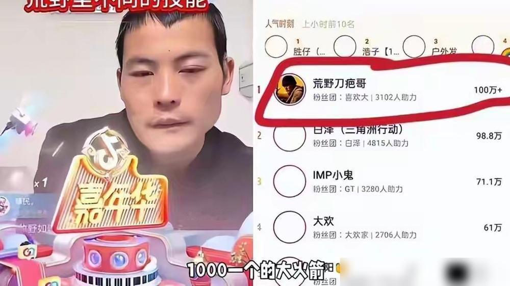 妈呀。赶快封杀这个刀疤哥吧,真的败坏社会风气,他参加个荒野求生的活动,才坚持了几天就退赛了,结果因为脸上有疤就意外火了,现在不仅成名了,还有代言。 我看完整个事,感觉就是一个人本来没啥起色,结果靠“意外”冲上来,然后所有人都跟着起舞的场面。 他当时才坚持了几天就退出,按理说也没啥成绩,偏偏因为那张脸被注意到,一夜涨粉几十万,还靠一场直播赚到普通人一辈子都够不着的钱。 最让我无语的是,他发现直播赚钱后,把兄弟姐妹都拉进来一起搞,连附近的村民也跟着不上班天天直播,像是突然找到了条捷径。 说个细节,我觉得很多人不舒服,就是他自己其实初中就辍学,还在没到法定年龄的时候就生了孩子,如今三十多岁一直没赚到钱,连报名费都是别人给的,却一下子踩着运气翻身。 我更在意的是,这种“只要火了其他都不重要”的氛围,很容易给人造成一种错觉:踏实上班好像还不如开个账号求打赏。 然后更绝的是,他还叫粉丝去支持家人账号,感觉像把这件事当成一门可以无上限复制的生意。 可能有人觉得他只是抓住机会,但我总觉得这种吃相太急,让人说不上好感。 大概也是个提醒吧:网络的风向来得快,也走得快,靠偶然起飞的故事看着爽,可真要长期靠这个活下去,说不准哪天就被反噬了。
