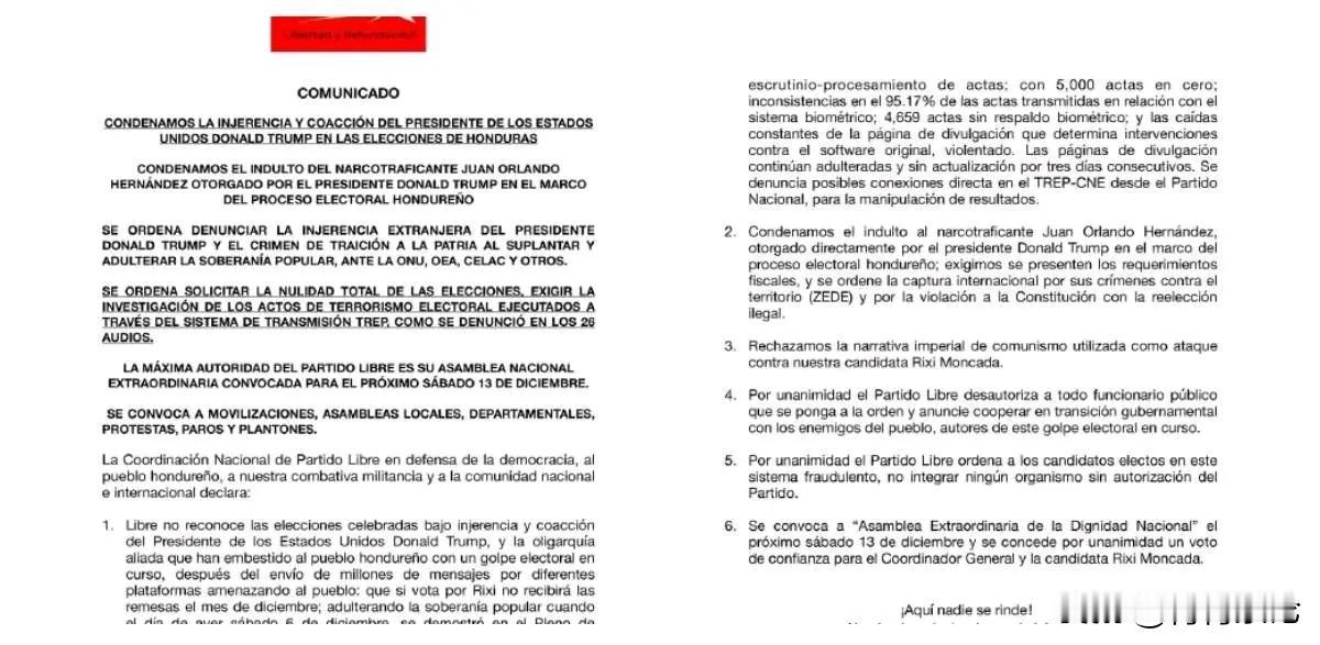 特朗普干预洪都拉斯大选!洪都拉斯执政党自由与重建党就美国总统特朗普干预刚刚过去的总统大选发表声明,指责特朗普对大选的干预和以及对整个国家的胁迫,并计划向联合国、美洲国家组织等国际和区域组织控诉特朗普的干预和胁迫行为。该声明还指出,他们要求全面作废本次选举。在本次选举中,来自执政党的候选人蒙卡达的得票数位居第三,被美国总统特朗普支持的候选人以及另一位男性候选人远远抛在后面。执政成绩还不错的自由与重建党肯定不会接受这个结果!