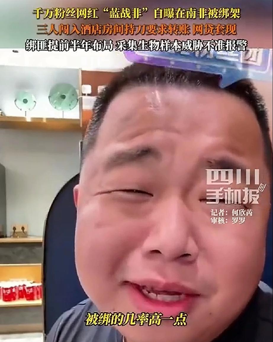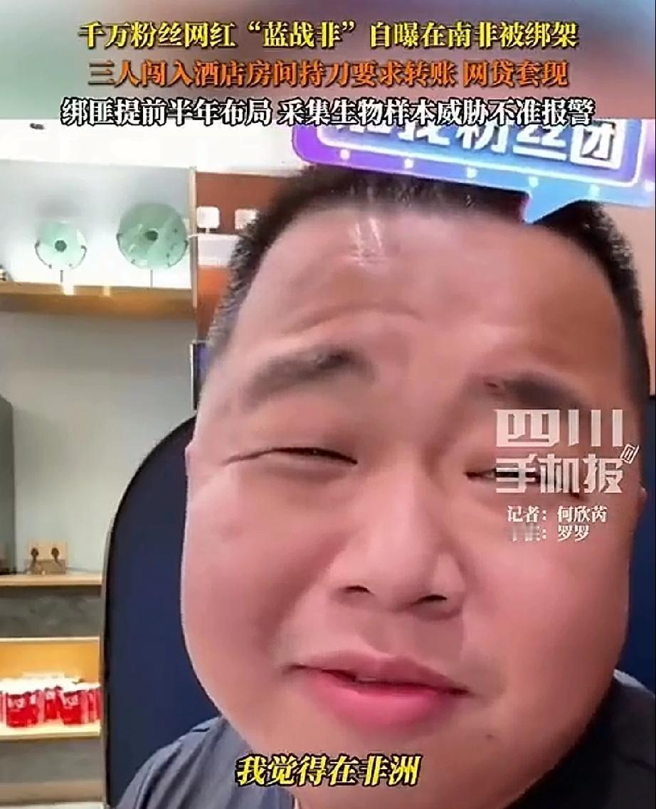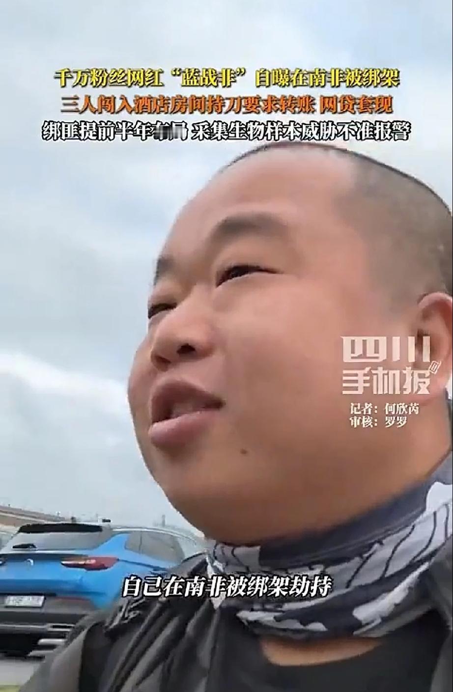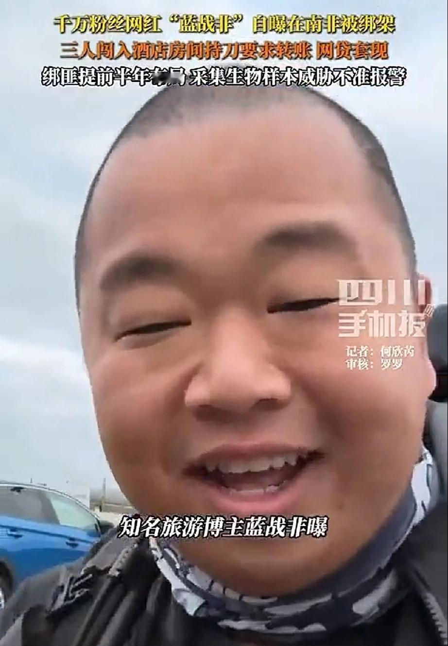 太炸裂了!知名旅游博主蓝战非在非洲南非遭遇中国人绑架。一名中国人带着两名黑人,将刀架在他脖子上,索要300万。 蓝战非身价过亿,近期旅游时曝光率较高,如今众人皆知他富有,这使他极易成为抢劫目标。“财不外露”这话确实有道理,尤其是在陌生之地,更不应显露财富。在国外,远离某些中国人也不无道理。 大家旅游,要注意安全。