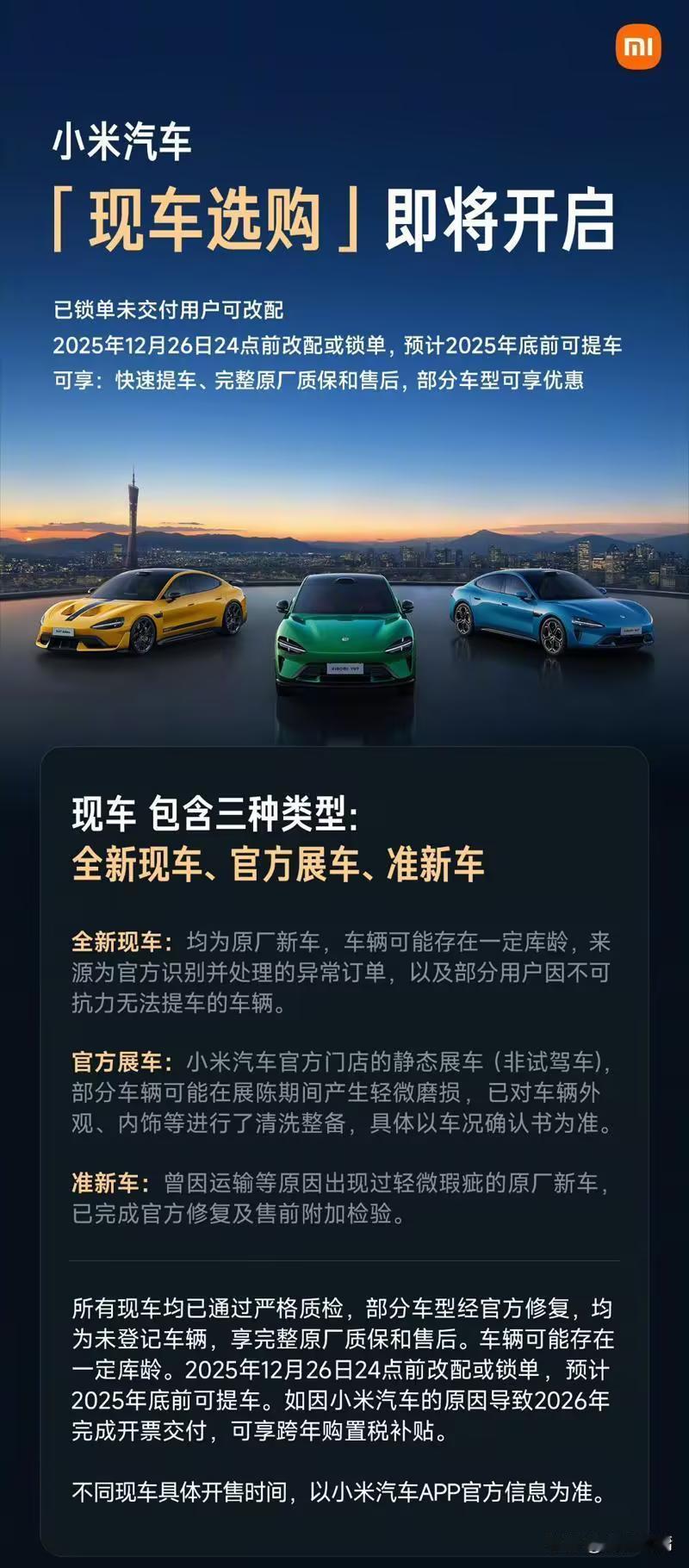 官方修复?啊,这官方售卖翻新车“小米汽车”这波操作绝了 2025年末,小米汽车推出“现车选购”服务,将官方展车、准新车等经修复的车辆纳入销售,“官方卖翻新车”的操作瞬间搅动行业。 此次现车分三类:全新现车是库龄较长的原厂新车;官方展车为门店静态展车,仅存轻微展陈磨损;准新车则是运输中轻微瑕疵、经官方修复的原厂车。所有车辆均通过质检,未登记且享完整质保,12月26日前锁单可年底前提车,部分车型有优惠。 这一举措被部分媒体称为“行业创新”:既帮车企消化库存、提升交付效率,也让消费者以低价快速拿到近新车。有网友认为“展车只是摆了几天,价格合适很划算”。 但质疑声同样强烈。消费者担忧“修复标准不透明”“瑕疵是否影响后续使用”,甚至直言是“割韭菜”——“花近新车的钱买‘二手’不划算”。行业内也有人指出,小米作为造车新势力,品牌信任度尚未稳固,此时推“翻新车”可能让用户质疑品控,损害品牌形象