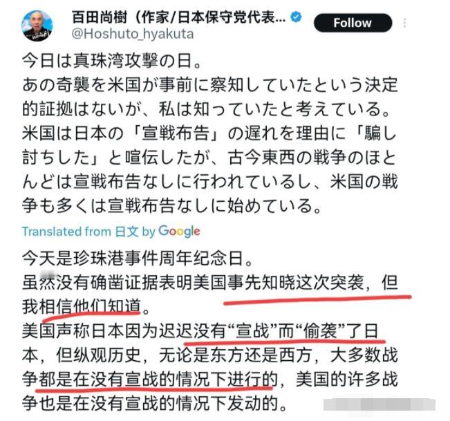 日本开始翻案了!12月8日,日本作家百田尚树公开表示,今天是珍珠港事件纪念日。虽然没有确凿证据证明美国事先察觉了那次奇袭,但我就是觉得他们早就知道了。美国拿日本“宣战公告延迟”当借口,大肆宣扬日本“不宣而战、搞偷袭”,可古今中外的战争大多是没宣战就开打,美国自己发动的战争也好多是不宣而战的。 这话听起来像给日本开脱,实则藏着整套扭曲的历史观。咱先把时间线捋清楚,1941年12月7日,日本6艘航母舰载机分批突袭珍珠港,炸沉8艘战列舰,炸死2403名美军。第二天美国对日宣战,太平洋战争爆发。百田的核心逻辑是:“古今中外打仗大多不宣战,美国自己也搞过突袭,凭啥单骂日本?” 这话有两个破绽,第一,日本偷袭前确实没宣战,但不是没时间。根据史料,日本外务省12月7日(东京时间8日)才把最后通牒交给美国,比第一波攻击晚了两小时。换句话说,日本飞机都扔炸弹了,宣战文书还在路上。这种“先斩后奏”在国际法上就是偷袭,跟“不宣而战”性质不同。 第二,百田故意忽略日本偷袭的预谋性。从1941年1月山本五十六制定“Z计划”,到11月26日航母舰队从单冠湾秘密出发,日本准备了整整十个月,甚至派间谍反复侦查珍珠港美军停泊位置。这种有计划、有预谋的军事行动,和临时起意的突袭完全是两码事。 百田为啥揪着“美国早知偷袭”不放?看看他的前科就明白。这个多次否认南京大屠杀、把日本描绘成“战争受害者”的右翼作家,惯用的手法就是转移焦点。他在《永远的0》里把神风特攻队美化成“为家人牺牲的英雄”,在《日本国纪》里编造“民族主义历史”,本质都是一个套路:淡化日本侵略罪行,把战争责任推给对方。 珍珠港事件中,美国三艘航母恰好不在港(“萨拉托加”检修,“企业”“列克星敦”执行任务),这本是巧合,却被百田当成“美国阴谋”的证据,言下之意,美国故意让战列舰挨打,好找借口参战。这种阴谋论在日本右翼圈子里很有市场,因为它回避了一个关键事实:日本偷袭珍珠港的根本原因,是为了争夺东南亚资源,继续扩大对中国的侵略。 更深层的问题在于,百田的言论折射出日本右翼对二战历史的系统性翻案。他们不提1931年九一八事变、1937年七七事变,不提日本在中国犯下的暴行,反而盯着美国的广岛长崎原子弹、东京大轰炸,把日本包装成“受害者”。 这种逻辑在安倍时期达到顶峰,安倍不仅推荐百田的书,还让他担任NHK经营委员,放任其在媒体上宣扬“自虐史观”。他们的目标很明确:通过否定“偷袭”的道德谴责,进而推翻整个战后国际秩序对日本的定性。 但历史细节骗不了人,日本偷袭珍珠港前,美国确实破译了部分密码,但情报分散在不同部门,没人能拼凑出完整的袭击计划。珍珠港当天,美军雷达曾发现大批飞机接近,却误判为己方侦察机。 这些失误被百田说成“故意纵容”,却忽略了一个常识:如果美国真有预谋,怎么会让8艘战列舰坐以待毙?更关键的是,日本偷袭的本质,是军国主义扩张的必然结果,1940年日本加入轴心国,1941年与美国谈判破裂,南下夺取资源的野心已经遮不住了。偷袭珍珠港不是“被逼无奈”,而是侵略者的主动选择。 百田的歪理,说白了是给日本军国主义招魂的话术。他抓住“不宣而战”的表象,掩盖日本发动侵略战争的本质;用“美国阴谋”的猜测,转移对日本战争责任的追问。这种逻辑在今天的日本仍有市场,背后是右翼势力对历史教育的渗透,他们主张课本只讲“日本的伟大”,隐瞒侵略罪行。 但历史真相不会消失:珍珠港的废墟里,沉睡着2403名无辜者;南京的纪念馆中,刻着30万遇难者的名字。任何翻案企图,都是对人类良知的背叛。