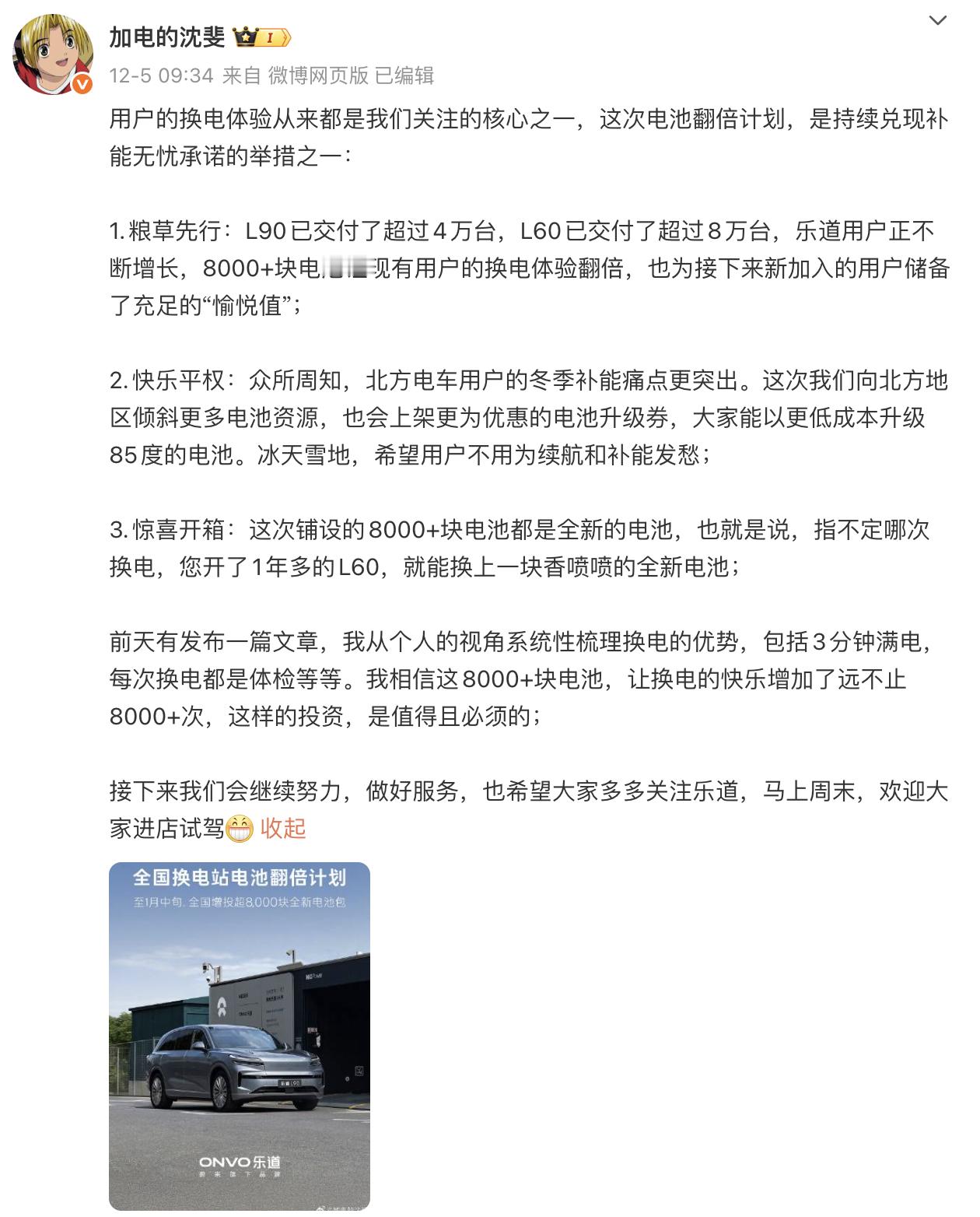 明年蔚来、乐道、萤火虫的增长,可能还没被完全预期到,哪怕乐道的增加,都会有迹可循,说几个有趣的事实:1、乐道最近搞了8000块电池电池翻倍计划,这个计划说出来时候,好像不那么震撼。要知道全国2500座支持乐道换电站(总换电站3600+),平均每座站3块乐道电池,也才7500块,现在一下子来8000,就翻倍了。用户体验提升,是能帮忙卖车的。2、这8000块电池是有成本的,估计得有6~8亿?蔚来Q4在财务算账如此明确的情况下,愿意加电池,这账一定是算清楚了。沈博说,简单来算,在浙江,因为一天有2个峰谷,一块电池,一年通过换电赚差价2万块(粗略的数字,需要一定的换电单量支持),换电的体系优势随着乐道热卖是增强的。3、8000块电池里面,有超过4500块是85度,早期乐道L90上市时候,电池产能不足,让用户BaaS 60度,如果这批用户需要永久升级,电池倍增之后,是更从容的。当然,已经用了60度换电之后,估计大部分用户也不想永久升级85度了。4、明年购置税增加,是所有人增加,BaaS扣除电池之后,再计算购置税,这个优势会让更多企业搞换电,哪怕是跟宁德时代搞风冷的廉价换电。几万块的车都能换电,都可以不担心电池衰减,几十万的车,不能换电,这个会在心理上打击。5、成本问题。过去,蔚来用75度电池,友商增程45度电池+发动机增程器。现在,乐道60度电池,友商大增程70度电池+发动机增程器,友商们在成本,以及车重,外加布局上没有优势。增程只能用来解决“心里觉得安全”那个解释成本门槛,为了这个门槛,企业会发现有点代价过大。50万充电桩讲里程焦虑,1000万充电桩还讲这个,总有讲不下去的一天。6、最后2个月,突然各地补贴撤走,没有那么平滑,造成所有人,包括乐道L90订单没有那么平滑是事实。这是行业共同问题,共同问题,也可以理解为不是问题。股票要跌大家一起跌,但是明年销量分化了,蔚来就不这样了。(非投资建议,个人观点)7、沈博是一个极为努力、接地气的人。他可以在晚上10点仍然跟一线直播,也会自己开着60度的L90到处巡店,更会写文章,尤其是前几天的大作,《超充的“极限”与换电的“无限”:一场不在同一维度的竞争》 ,如果你足够聪明,读得懂的。网页链接 沈博做的所有的事,都是在为了卖车,作为子品牌的领导人,就该这样。斌哥可以说星辰大海,乐道就该好好卖车。你去看看APP的名称,蔚来叫蔚来,乐道叫乐道汽车,乐道就是要踏实把面向“家”的产品,定义好、卖好的。