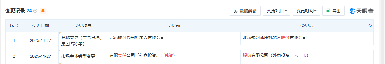 【#银河通用辟谣拟明年初赴港上市#:不属实】红星资本局12月9日消息,今日有消息称,国内人形机器人独角兽企业银河通用正在筹备赴港上市,并称其上市已经筹备数月,预计明年一季度交表。对此,红星资本局向银河通用进行了求证,银河通用相关负责人表示,以上信息不属实。11月27日,天眼查信息显示,银河通用完成股改,市场主体类型从“北京银河通用机器人有限公司”变更为“北京银河通用机器人股份有限公司”,企业类型从有限责任公司变更为股份有限公司(外商投资、非上市)。网页链接