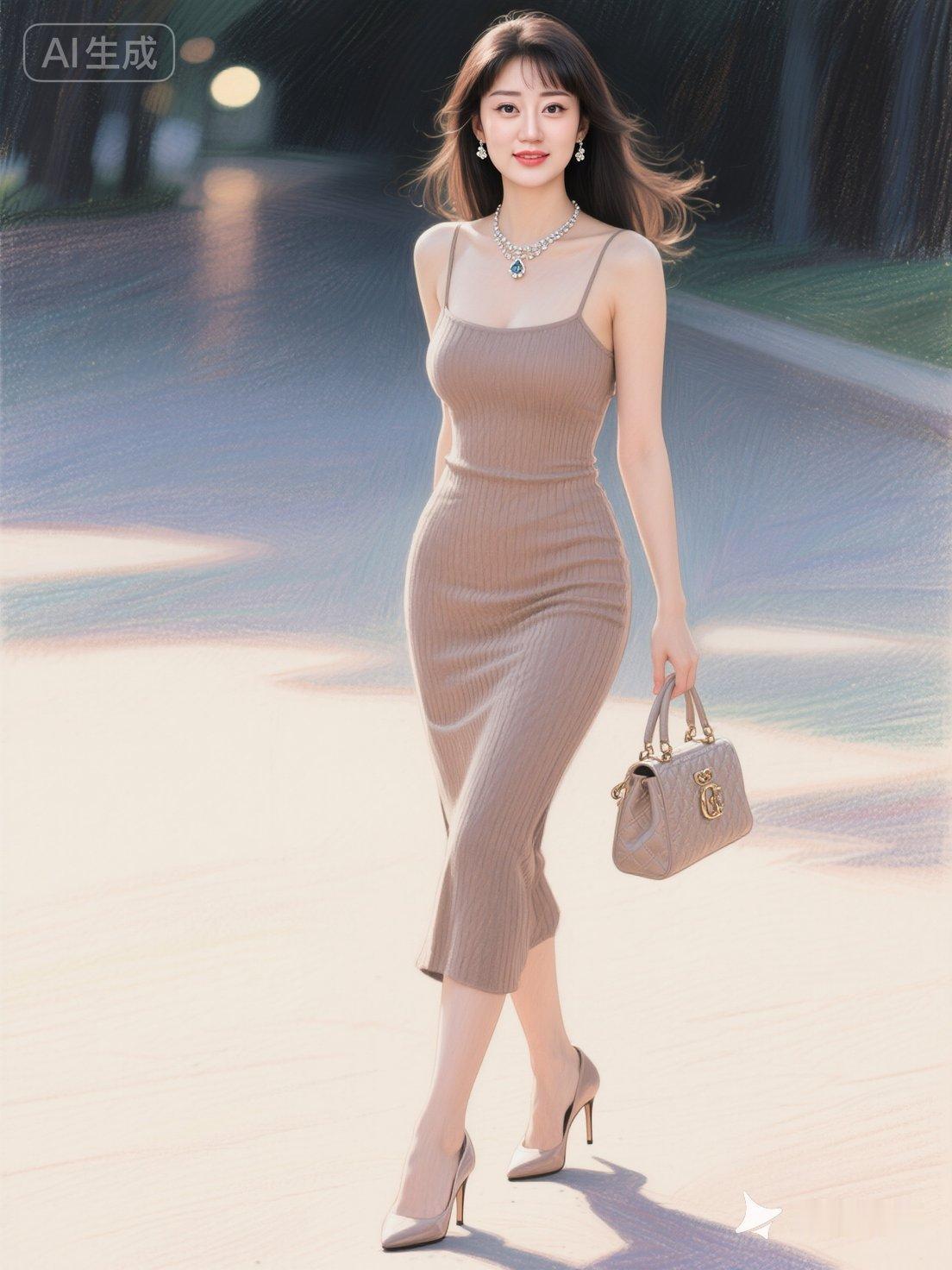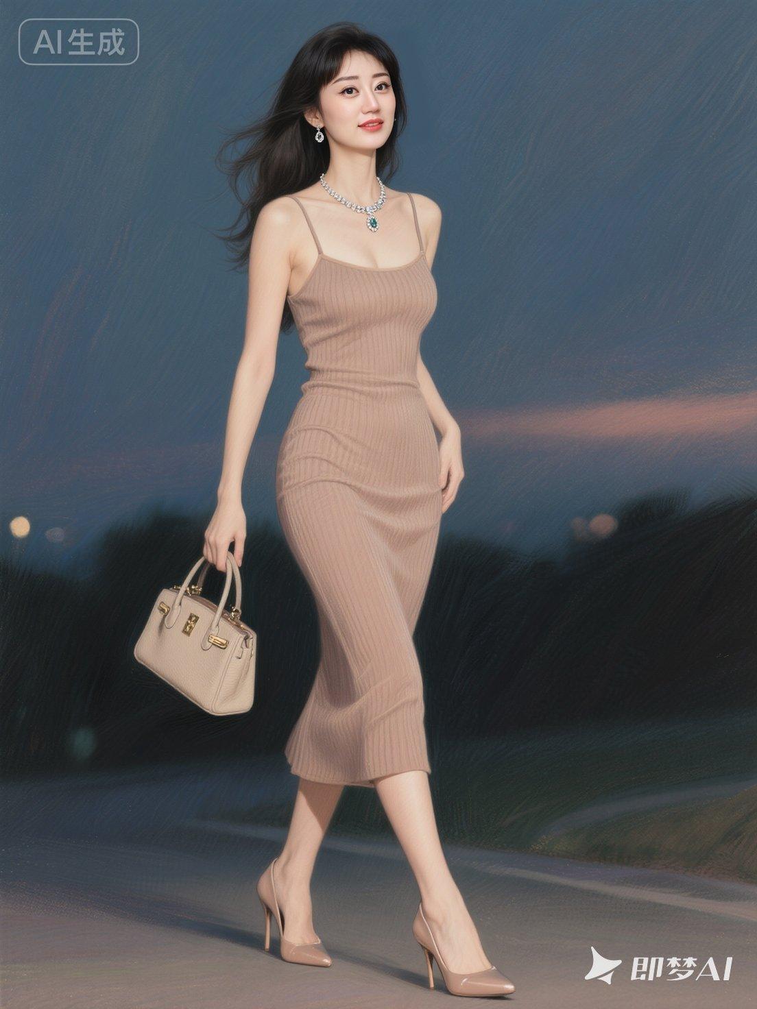 一位身着时尚吊带裙同色系高跟鞋,的绝色美女。连衣裙细腻纹理与身体曲线完美贴合,葫芦形身材在晚风中更显丰腴灵动